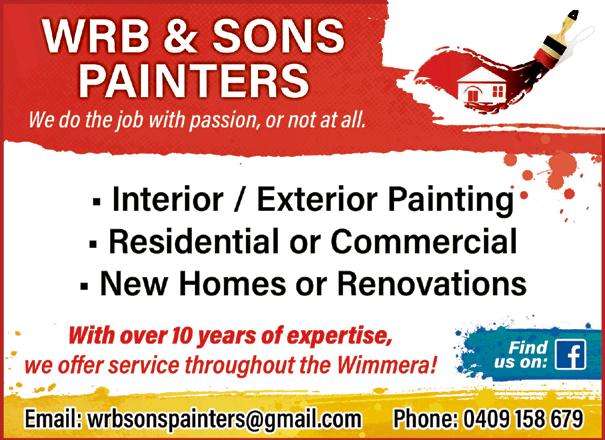 Page 51 Wednesday, March 13, 2024 www.theweeklyadvertiser.com.au concrete cosmetics Brett Campbell 0438 596 682 | cambo098@gmail.com BEFORE AFTER • Spray Pave • Acid Staining • Concrete Grinding • Epoxy Floors • Exposed Aggregate Cleaned & Resealed DRIVEWAYS • ALFRESCO’S • SHED FLOORS spOrT Brought to you by 18-20 Pynsent Street, Horsham • Ph: 03 5382 3823 Need an electrican? See WE HAVE THE TOOLS TO MAKE YOUR JOB EASIER IT WILL STILL BE HARD BUT IT WILL BE LESS HARD WE HAVE EXTENDED OUR FIELD DAY PRICES UNTIL THE END OF THE MONTH! Missed this year’s Wimmera Machinery Field Days? THE DISTRICT’S LARGEST RANGE OF INDUSTRIAL SUPPLIES LARGEST & INDUSTRIAL SUPPLIES 60A Darlot Street, Horsham Ph (03) 5382 5244 | AH 0418 504 111 www.horshambearings.com.au “think local, buy local” Last chance to make grand finals The remaining positions in all grades of Central Wimmera Tennis Association grand finals are up for grabs this weekend. In pennant, Horsham Lawn secured a grand final position while, after a long weekend break, Central Park and Drung South will return to the courts for a