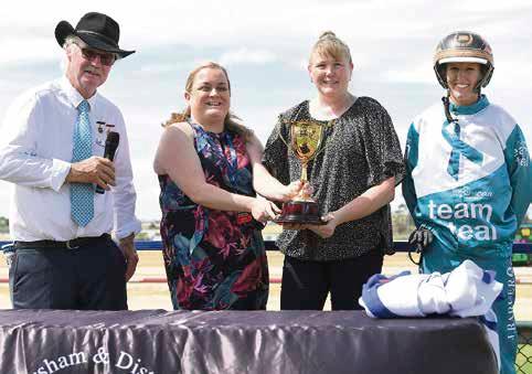 SUCCESS: Sew What, driven by Jackie Barker, right, won the 2024 Horsham Pacing Cup, presented to trainer Dianne Giles by Horsham Harness Racing Club president Terry Lewis and The Weekly Advertiser’s Lauren Henry.
