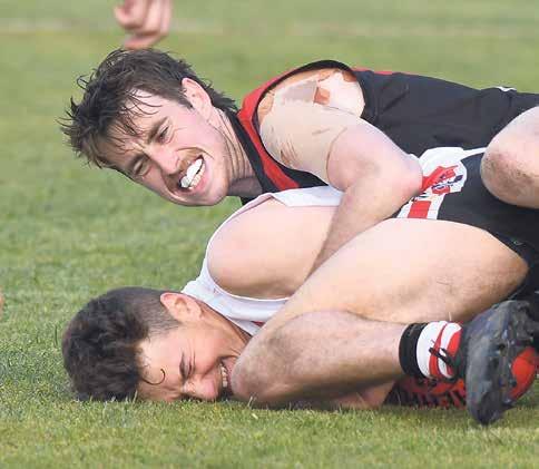Minyip-Murtoa’s Jye Walter cops a hand to the face as he attempts a high-flying mark over Warrack Eagles opponent Aaron Watts in the final round of Wimmera league senior football on Saturday at Murtoa. The Eagles tested the Burras in a low-scoring game, resulting in a 4.9 (33) to 3.4 (22) win for Minyip-Murtoa. The Burras will play an elimination final against Dimboola on Sunday in Ararat, while Horsham Saints and Southern Mallee Giants will battle it out in a qualifying final at Murtoa on Saturday for a chance to take on Ararat in a semi-final next weekend. Story, page 69.
