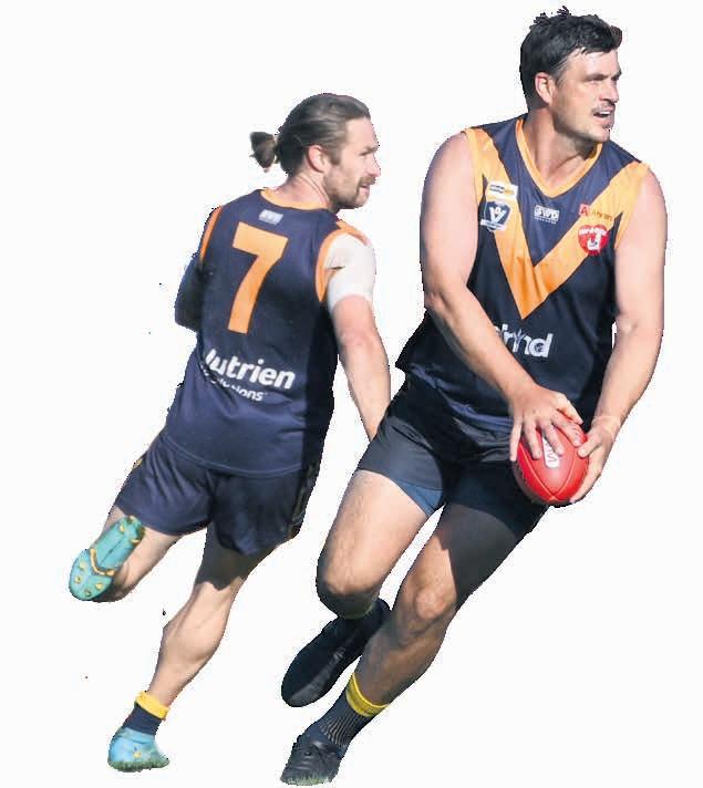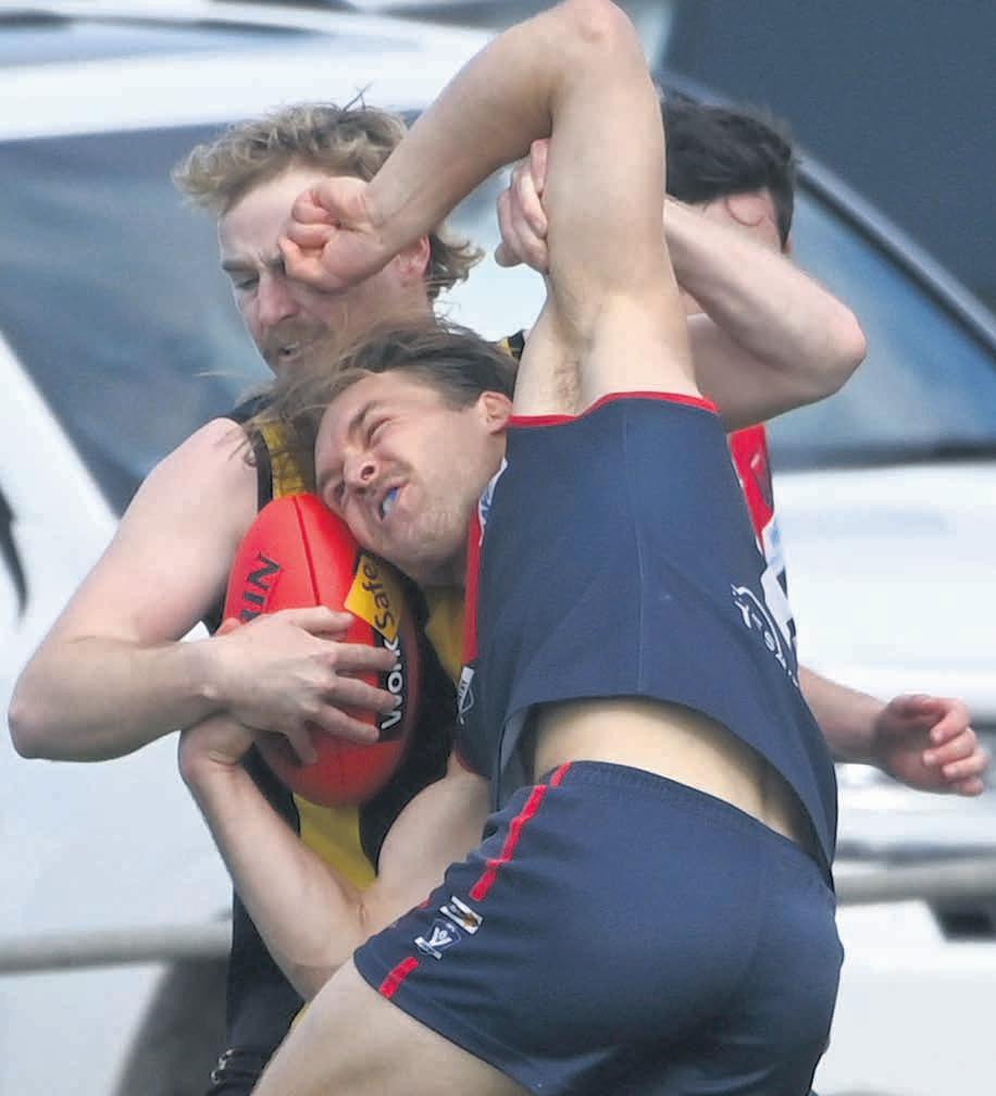 Star Pimpinio onballer Matt Rosier gets a kick away under pressure from Laharum’s Jackson Price in a Horsham District Football Netball League elimination final at Pimpinio on Sunday. Rosier starred for the Tigers in the senior team’s return to finals after a 15-year finals drought. It was their first finals win in 17 years. The Tigers next take on Noradjuha-Quantong, who demolished Rupanyup by 139 points on Saturday, and Harrow-Balmoral will play Swifts after both teams enjoyed a week off.