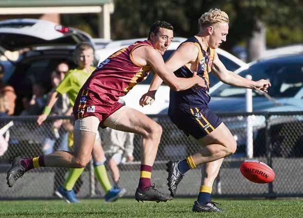Nhill coach Jake McQueen drives his team forward in the Tigers’ 32-point win against Warrack Eagles at Anzac Park in Warracknabeal on Saturday. McQueen kicked five goals in the win to help Nhill move within one game of the Wimmera league’s top five. They will take on third placed Southern Mallee Thunder in Nhill this week. In the round’s big news, Horsham Demons upset flag hope Stawell at Horsham City Oval. Story, page 63.