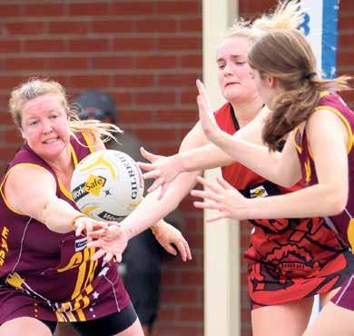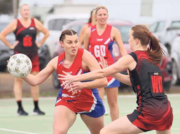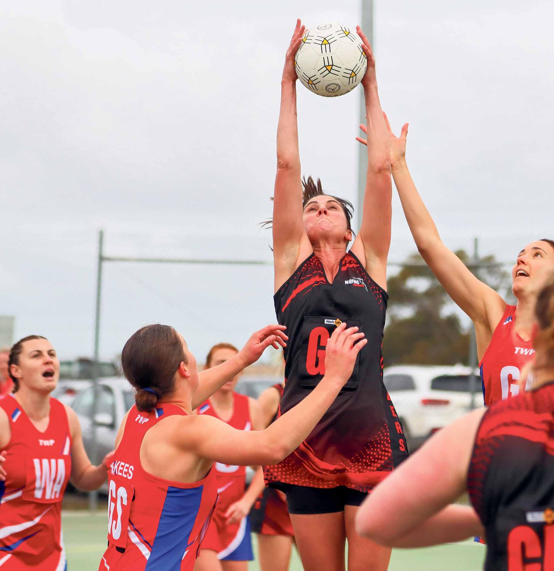 Noradjuha-Quantong is within striking distance of a finals berth after defeating Kalkee in Horsham District league’s A Grade netball at the weekend, 50-54. Bombers defender Brooke Pay leaps for the ball over Kalkee goal-attack Jenna Bywaters during the round seven clash. The result sees Kalkee drop to third place on the ladder, one win ahead of Saturday’s victors. Story, page 64.