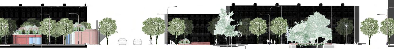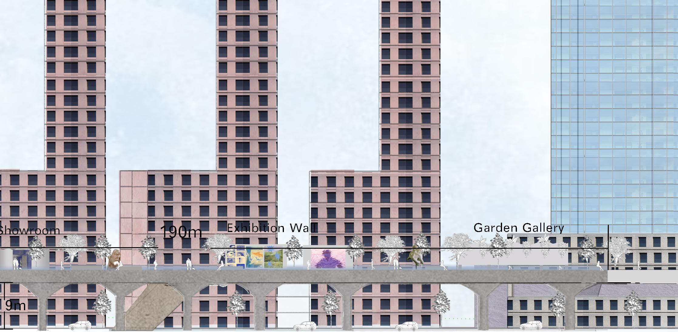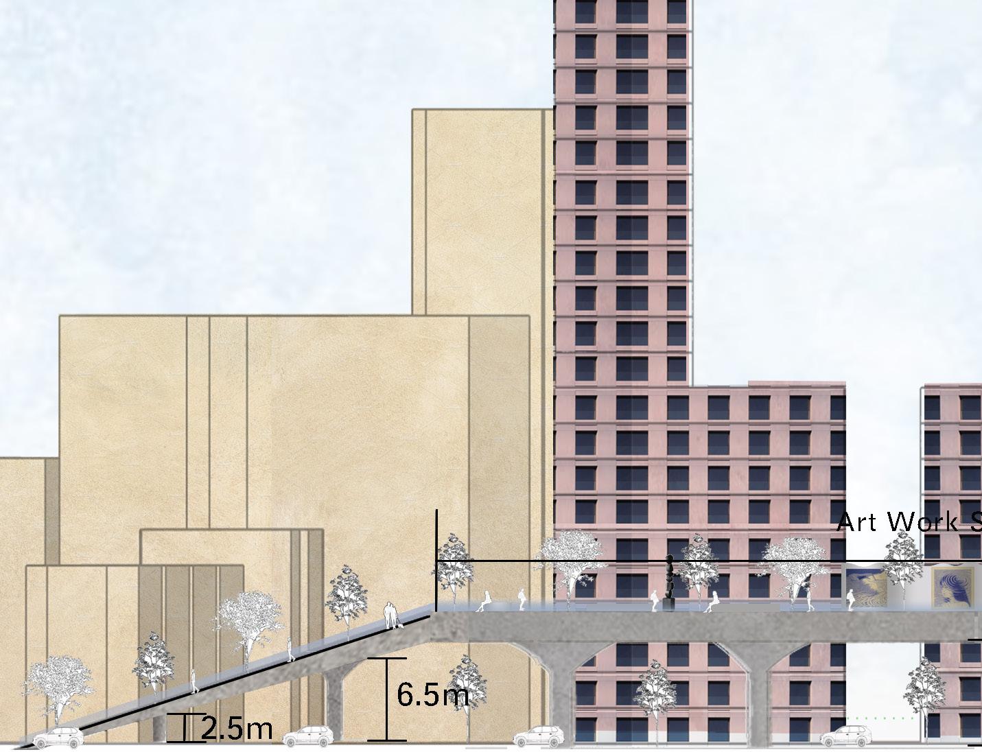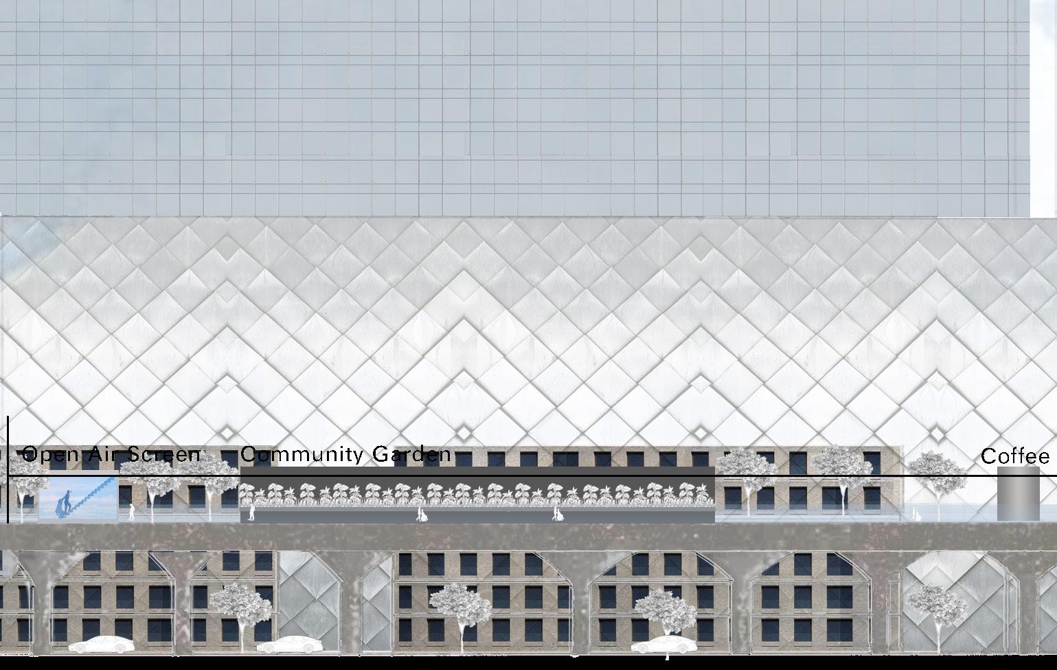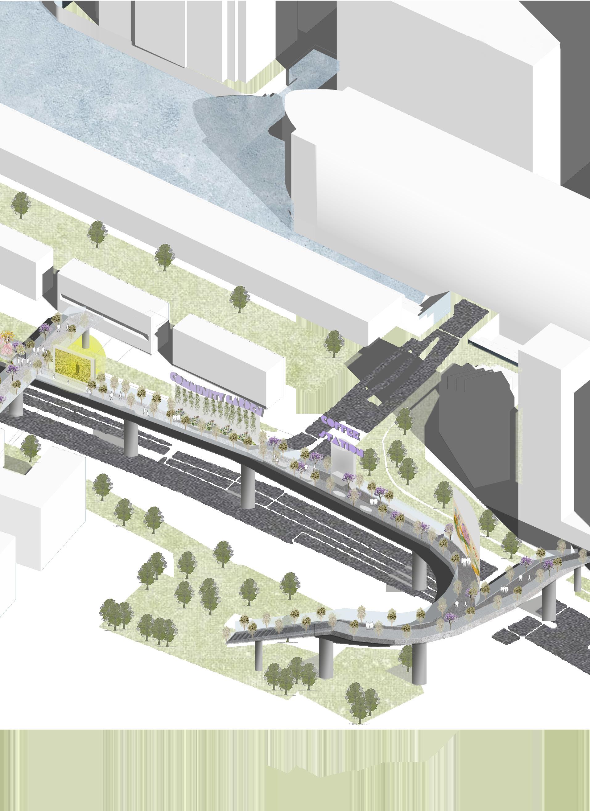 CA3 is the arts, culture, and commerce zone of the Green Spine/bridge. It will include dedicated market spaces and small commercial units for rent, seating, street furniture, and space for users to dwell. CA3 can also host a variety of public artworks, mixing permanent installations with temporary exhibitions. These activities will help establish the bridge as a destination, notsimply a place to move through.