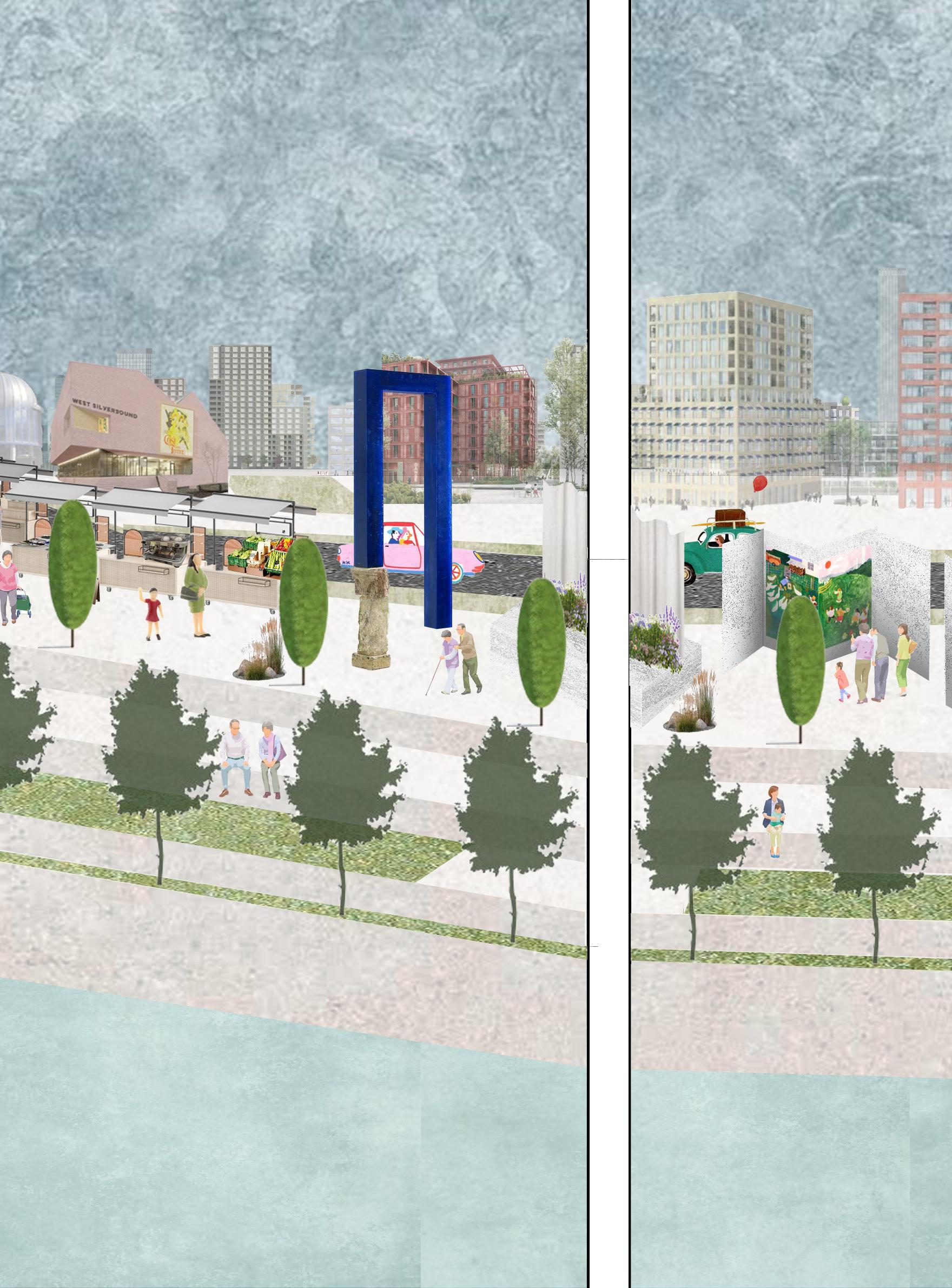 Silvertown's relationship to the river is strengthened and the area is revitalised by a bustling waterfront with festivals, markets, and local stores.