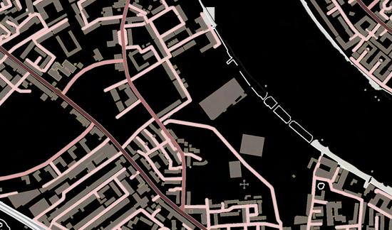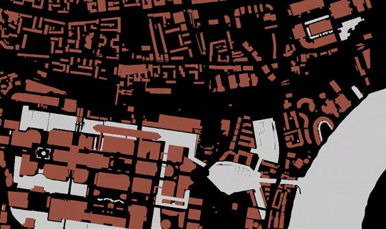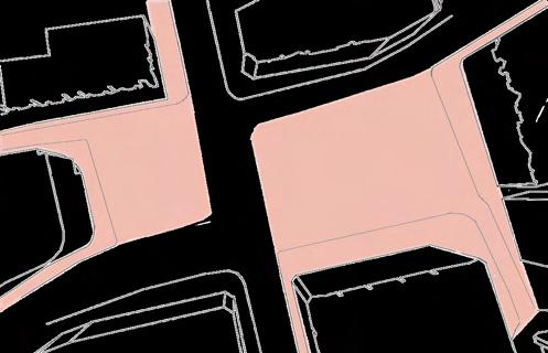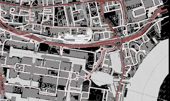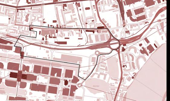 The figure-ground study depicts a disjointed architectural environment where big industrial blocks predominate and there are significant spaces between them. The site's limited spatial definition and poor walkability are caused by the absence of human-scale urban grain.