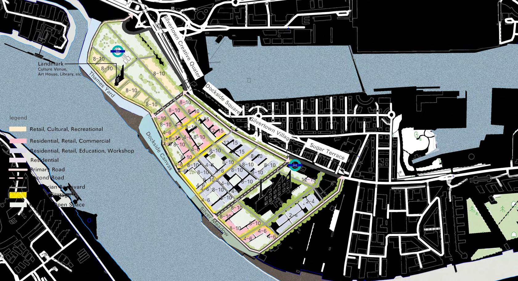 With an emphasis on revitalising the neighbourhood around the Tate & Lyle sugar factory and the new construction sites near the proposed Thames Wharf DLR station, this design code lays out a legal framework for directing future development in West Silvertown. By creating a thriving creative, cultural, and artistic district, the goal is to encourage the adaptive reuse of underutilised spaces. The code aims to create a strong sense of place based on artistic expression and cultural identity by combining affordable residential and commercial development. Zoning, land use, building typologies, street hierarchy, and methods for fusing industrial legacy with upcoming cultural development are all covered in the guidelines. These components work together to create a complete urban design toolset that will help West Silvertown develop into a unique, welcoming, and character-rich community in the future.