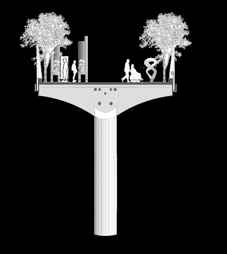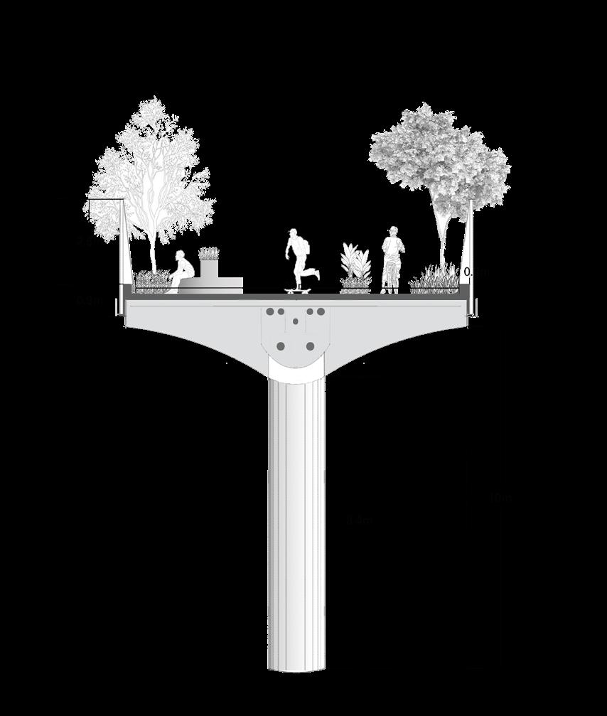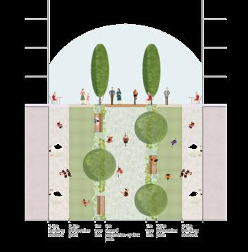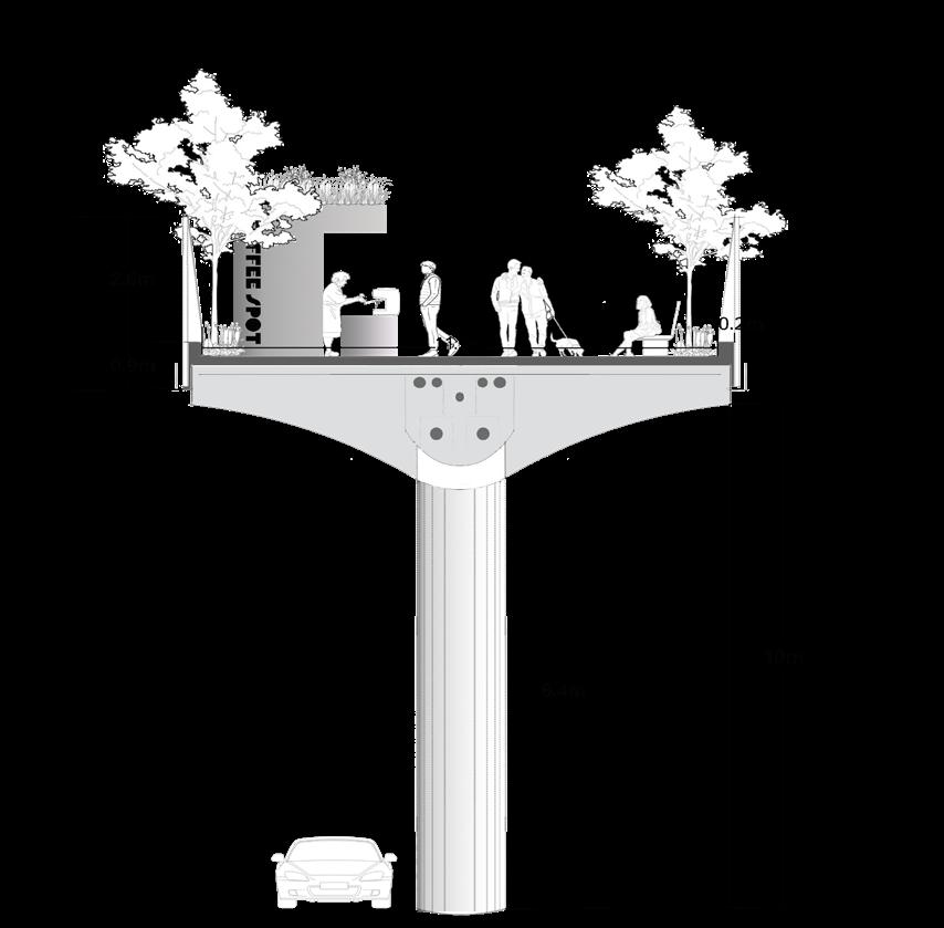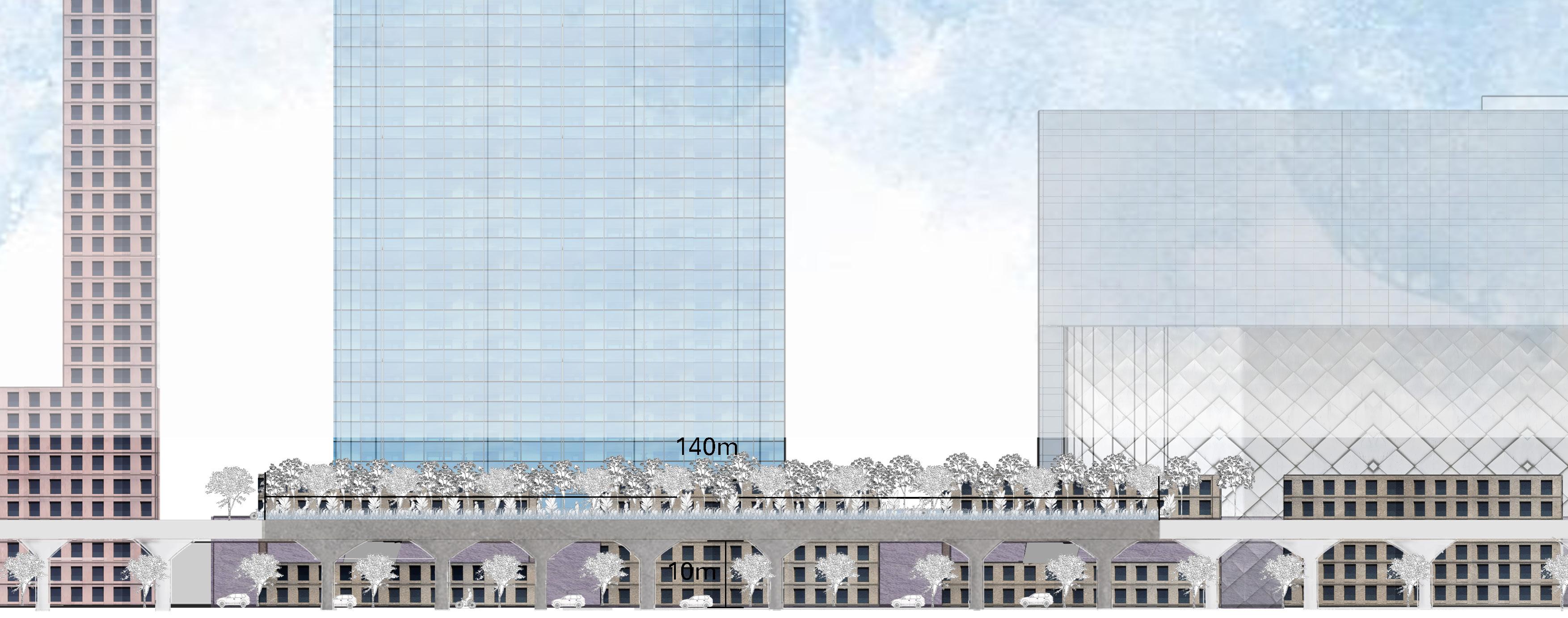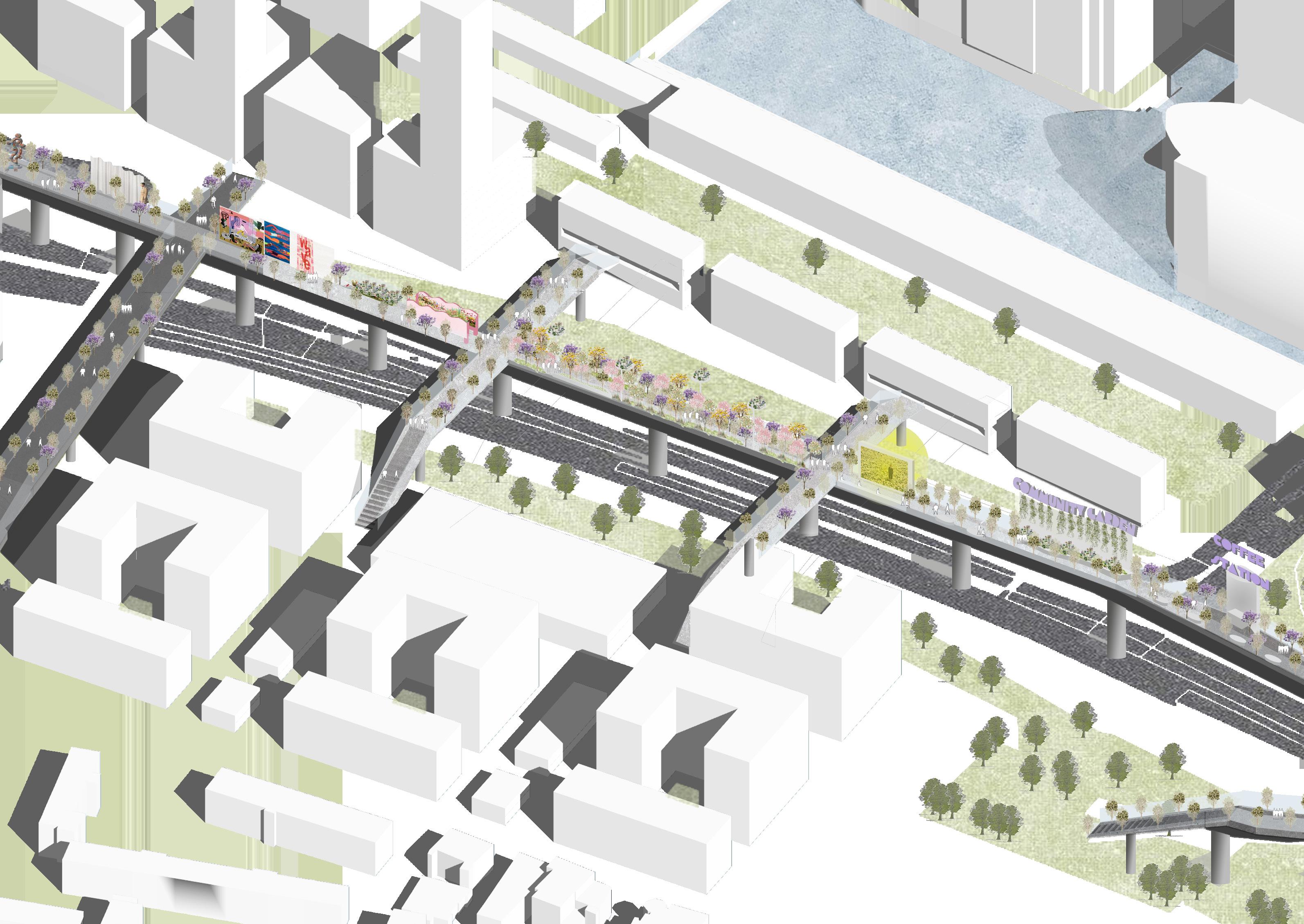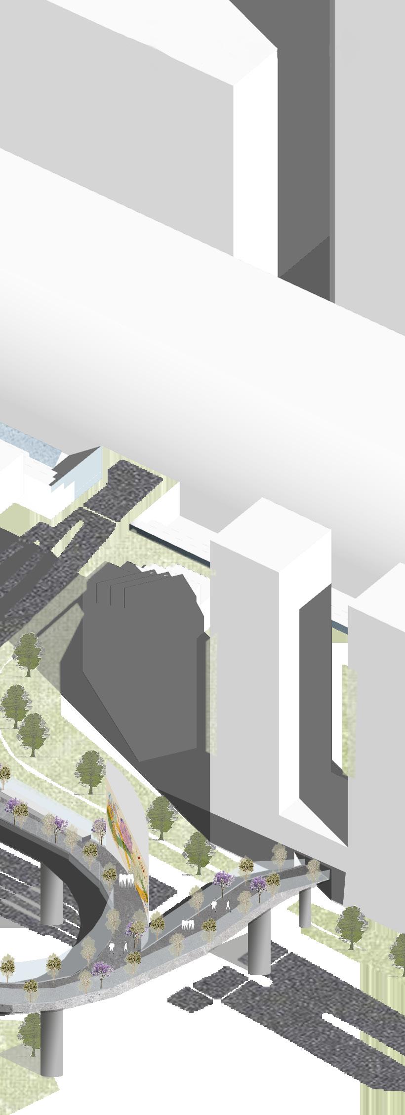 CA3 is the arts, culture, and commerce zone of the Green Spine/bridge. It will include dedicated market spaces and small commercial units for rent, seating, street furniture, and space for users to dwell. CA3 can also host a variety of public artworks, mixing permanent installations with temporary exhibitions. These activities will help establish the bridge as a destination, notsimply a place to move through.