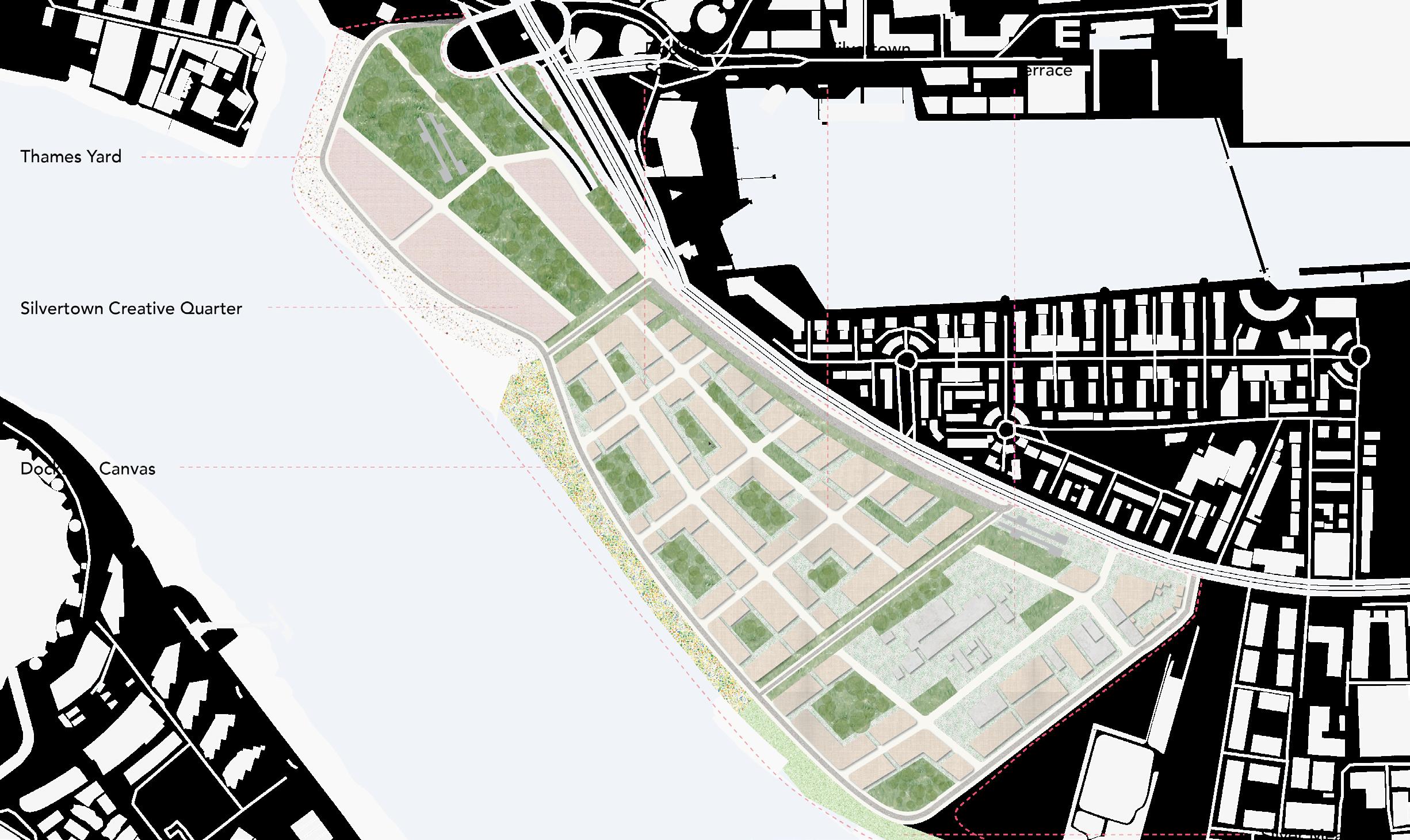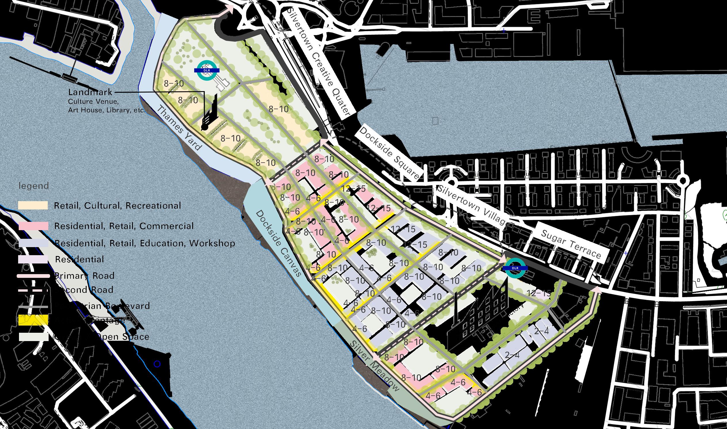 This design code sets a design framework to guide future development in West Silvertown, focusing on revitalising the area around the Tate & Lyle sugar factory and proposed Thames Wharf DLR station. It promotes adaptive reuse of underused spaces to foster a vibrant creative, cultural, and artistic district. Through affordable residential and commercial development, the code aims to build a strong sense of place rooted in artistic expression and cultural identity. It outlines zoning, land use, building types, street hierarchy, and strategies to blend industrial heritage with new cultural growth, forming a comprehensive urban design toolkit for a distinctive, inclusive neighbourhood.