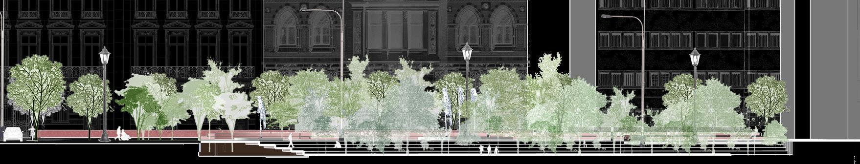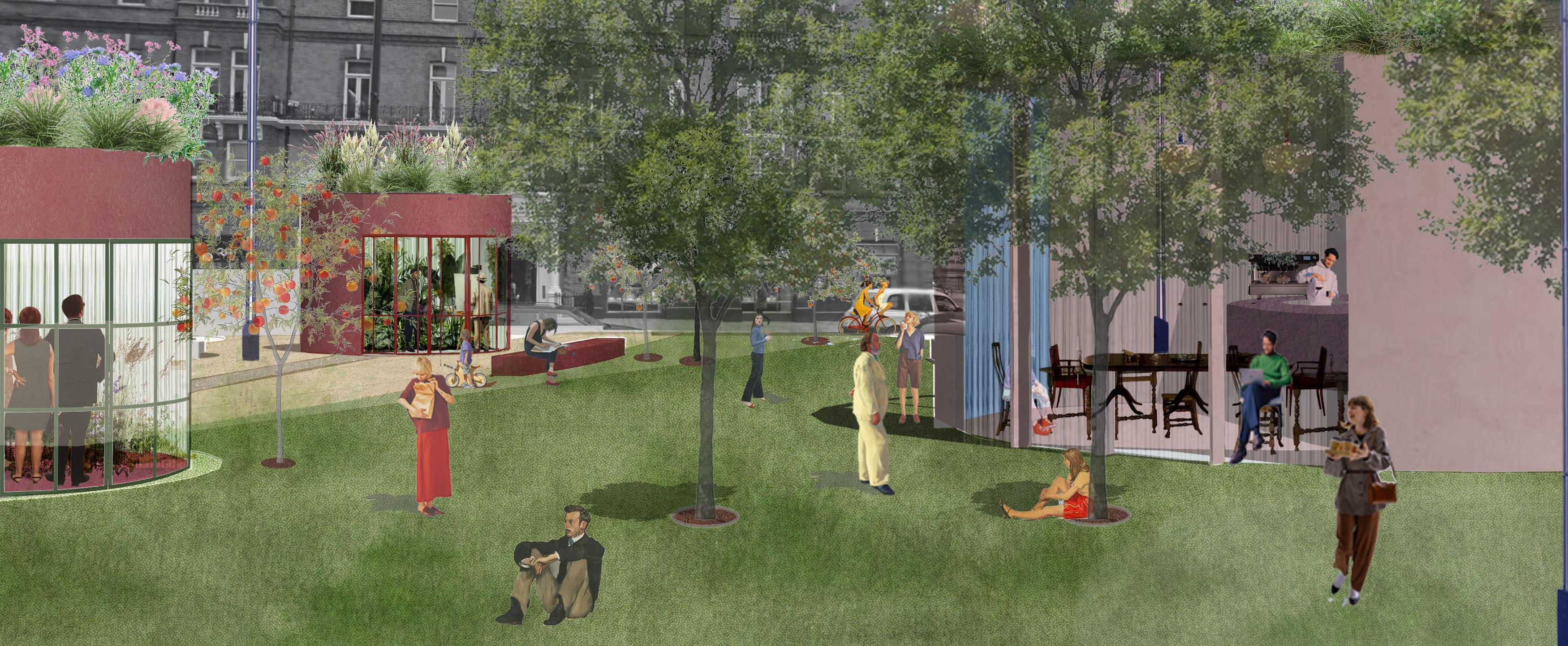 Sloane Square's original traffic-dominated area has been transformed into a lively, people-focused public square thanks to this makeover. To improve walkability and social interaction, the plan includes curved walkways, layered green areas, and interactive areas. Shaded seating sections, water features, terraces with plants, and tiny pavilions that facilitate community events are some of the main attractions. The design enhances connectivity and visual coherence throughout the square while creating a warm, inclusive ambiance by softening sharp edges and incorporating lush landscaping.