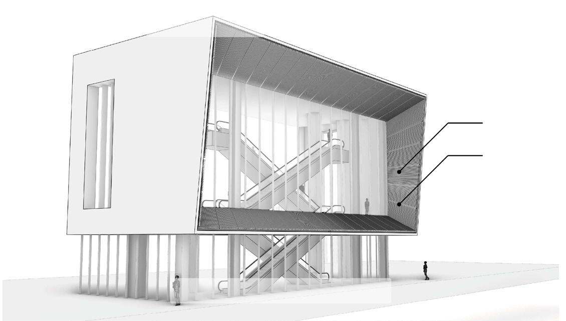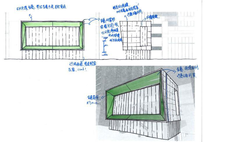項目應用單元式模矩,因此從整體模矩分割開始,漸進式的觀察立面設計比例,並為立 面增加線條的律動感,同時,探討帷幕構造的施作,並應用到立面材料的層次與轉角的延 伸等各介面的細部檢討。