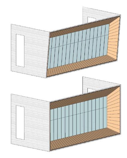 單位量體的考量,除了上下尺寸差異外,更增加了傾斜的元素,而 也無可避免帶來了雙曲的側邊,團隊利用幾何分析進行思考,提出 了數種的解決方案,並進行細部檢討。