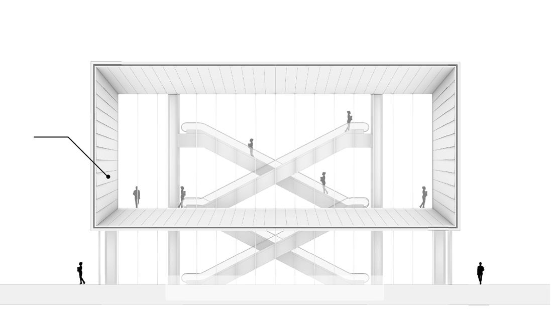 北向因應著電扶梯的上樓空間,創造了獨特的大型觀景窗,設計