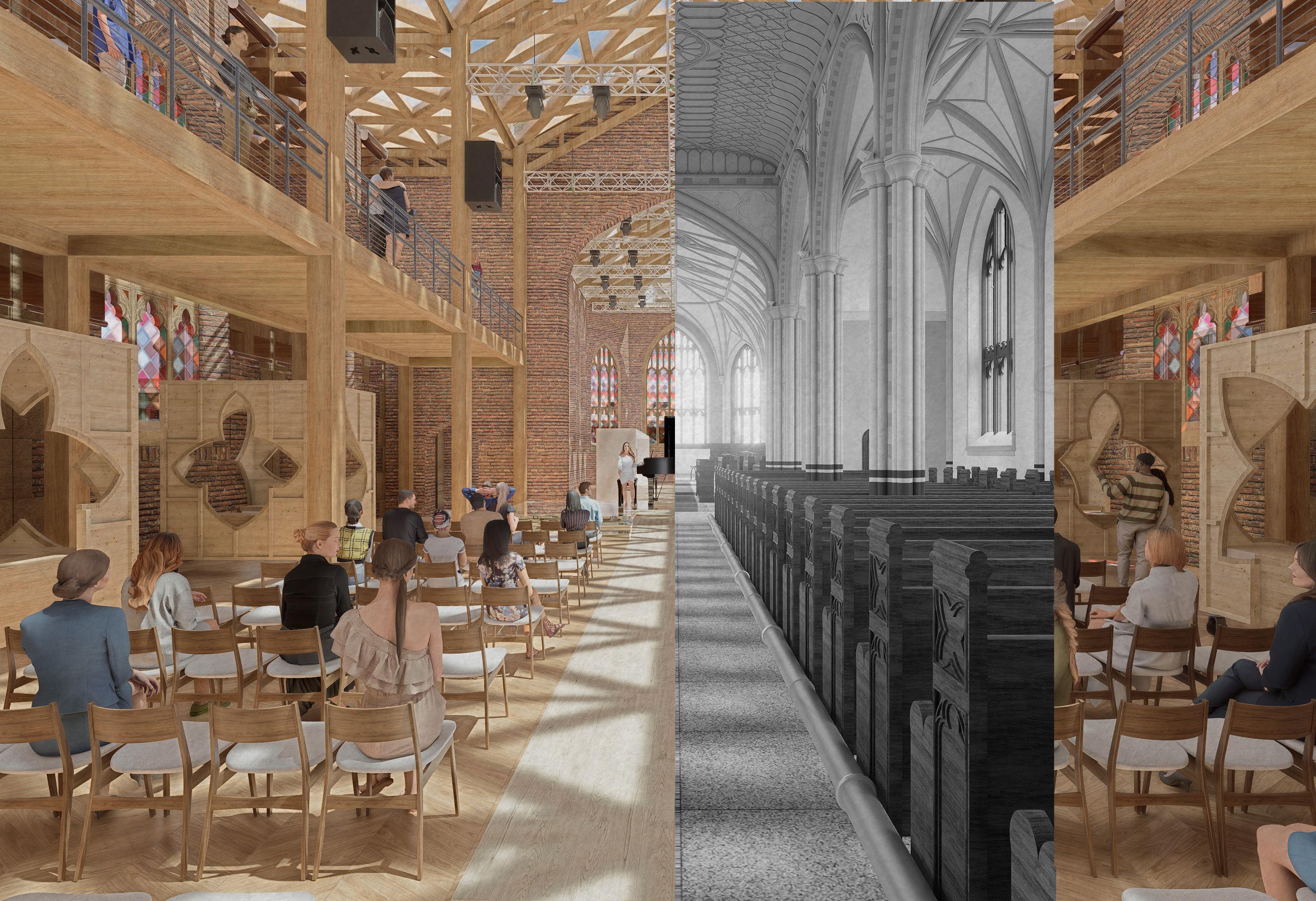 Architectural moment 1 is cut through the middle of the existing church, revealing a generously sized multifunctional hall that capitalizes on the building’s vast interior volume to accommodate exhibitions, concerts, lectures, and other community events. By preserving the church’s historical character—such as its vaulted ceilings and structural rhythms—while introducing new interventions in flooring, acoustics, and circulation, the project maintains a respectful balance between heritage and functionality. The newly inserted floor system integrates carefully with the existing load-bearing walls, ensuring stability and compatibility with the original structure. Proposed trusses reinforce the roof and redistribute loads, preserving the historic envelope while integrating performance standards.