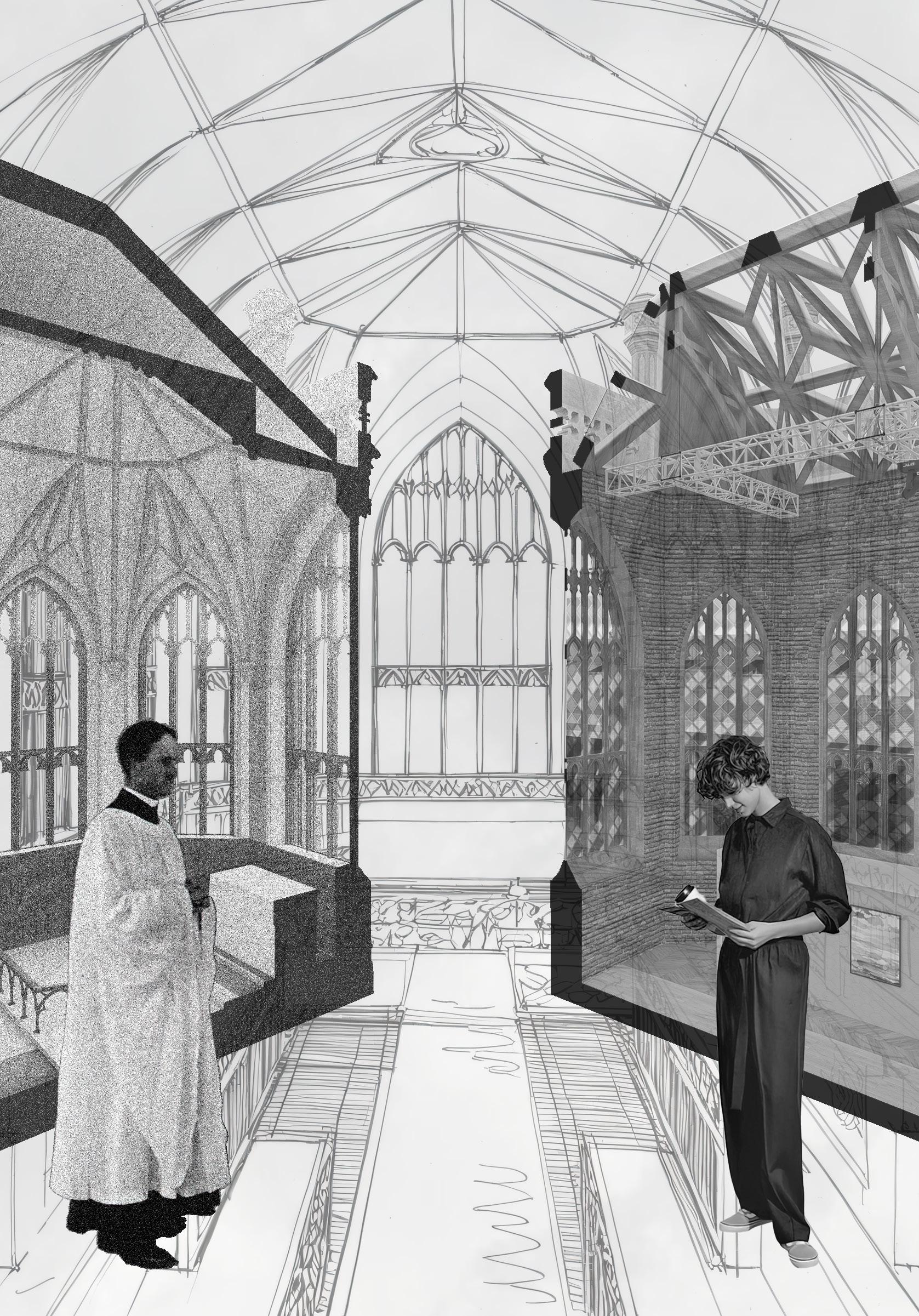 Central to this vision is a multifunctional hall, positioned to host a variety of events such as public talks, smallscale concerts, and temporary exhibitions. By adapting and updating essential infrastructure, the hall can seamlessly transition between different uses, ensuring that both intimate gatherings and larger public events are accommodated with minimal intervention. Local artists also play a pivotal role in this proposal. Drawing on the historical significance of St Luke’s, the Church will serve as a place of inspiration and collaboration for artists seeking to develop their practice. The adapted chancel, converted into a dedicated gallery space, provides a distinctive setting for rotating exhibitions that celebrate the creative output of the community.
