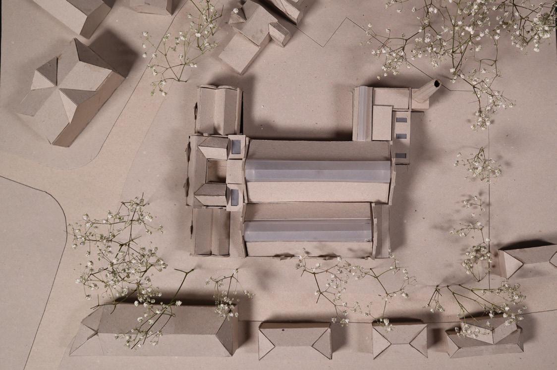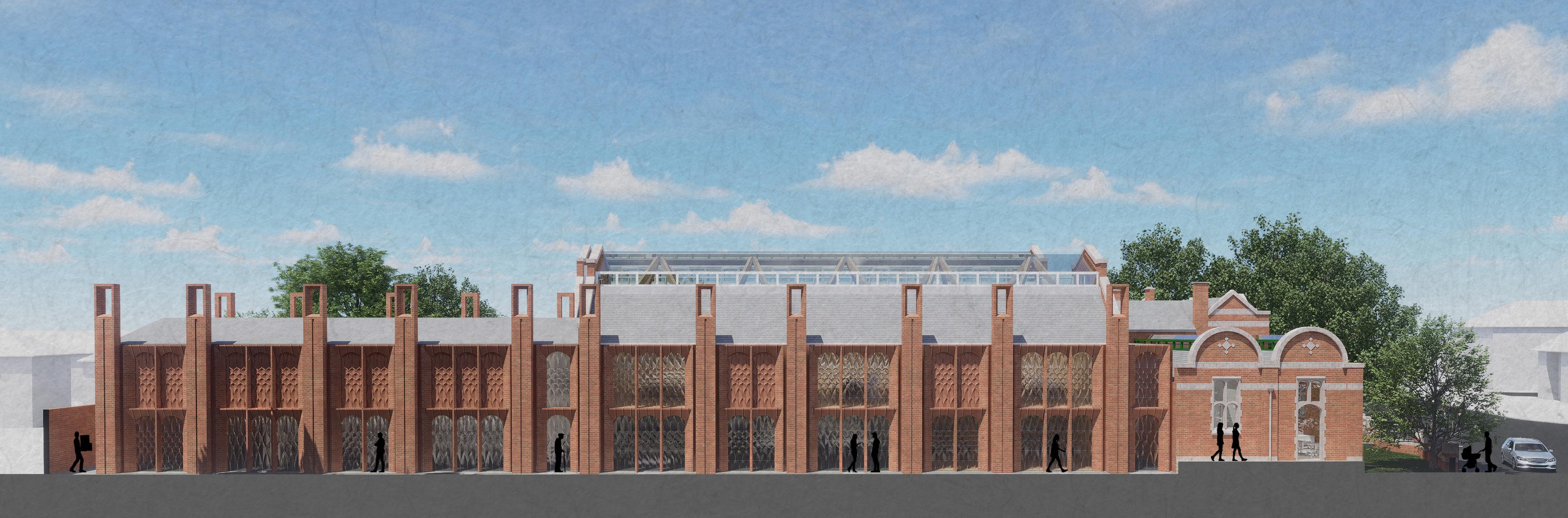 It showcases the iterative process behind the proposed Withington Bath elevation—from early concept sketches to digital rendering and finally into a 1:50 physical model. Early sketches drew inspiration from the facing historic facade but were challenged by outdated architectural features unsuited to the new design. Rather than discarding them, these elements were reimagined to serve contemporary needs; for instance, decorative rooftop details evolved into natural ventilation towers, inspired by Níall McLaughlin Architects’ new library at Magdalene College in Cambridge.