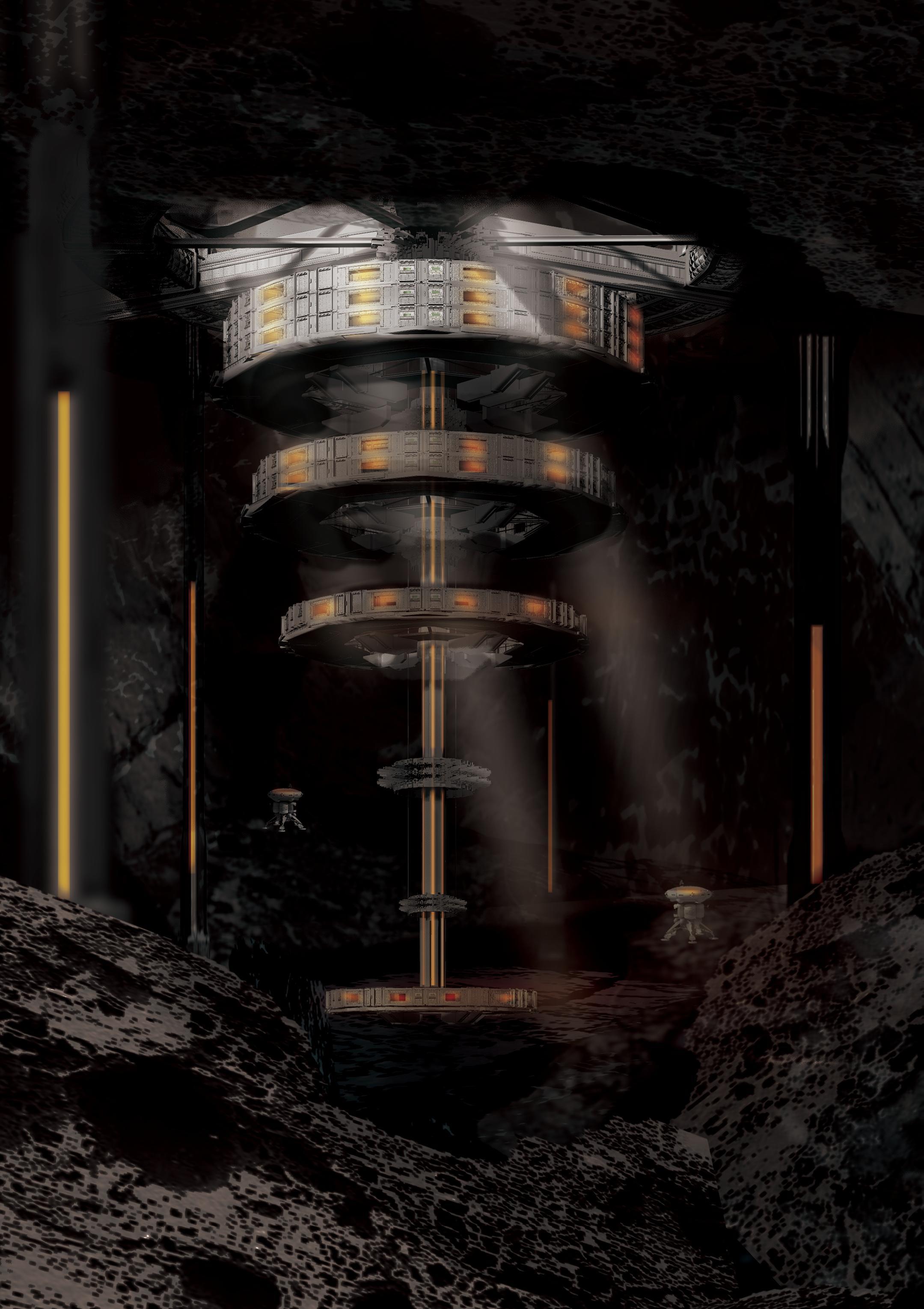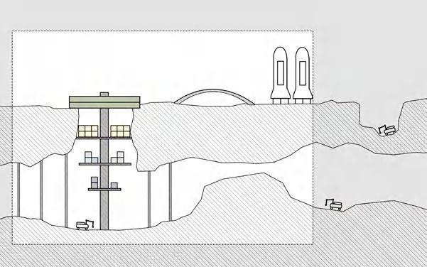 Residential modules on the first floor underground, public on the middle and experimental on the lowest.