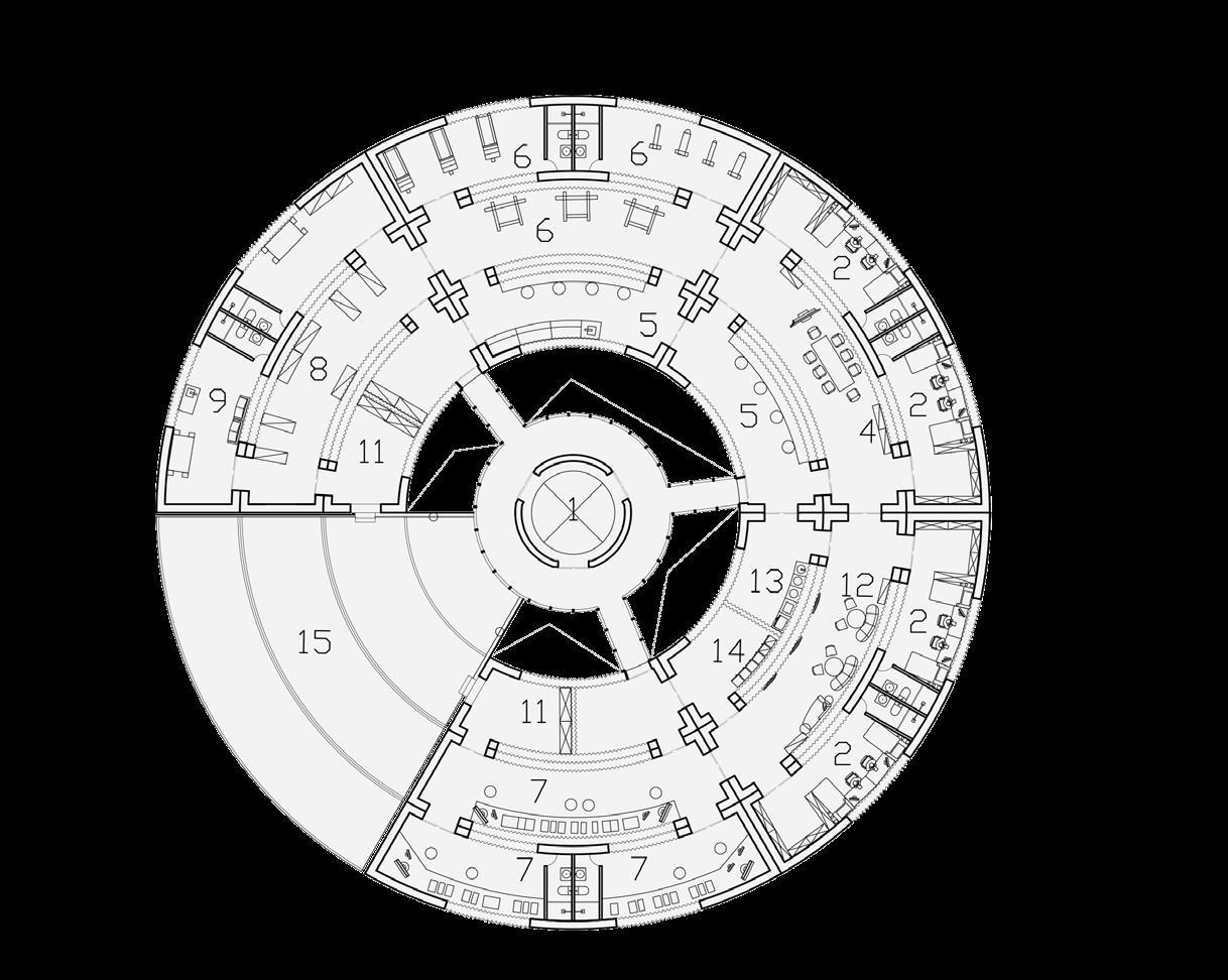 The greenhouse laboratory is located on the lunar surface and serves as the core of the selfsustaining system, supporting plant growth and providing food and oxygen for the lunar village. By recycling wastewater and carbon dioxide, the greenhouse creates a closed-loop ecosystem, cultivating plants, mushrooms, and mealworms to provide essential nutrients. The ground floor features a therapeutic garden that simulates Earth's environment, promoting astronauts' mental health and creating a relaxing garden space.