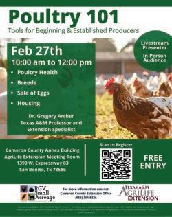 Texas A&M AgriLife Extension is excited to share its upcoming program, Poultry 101: Tools for Beginning & Established Producers. Join Texas A&M Professor and Extension Specialist Dr. Gregory Archer for a livestream presentation covering poultry health, breeds, housing, sale of eggs, and more.