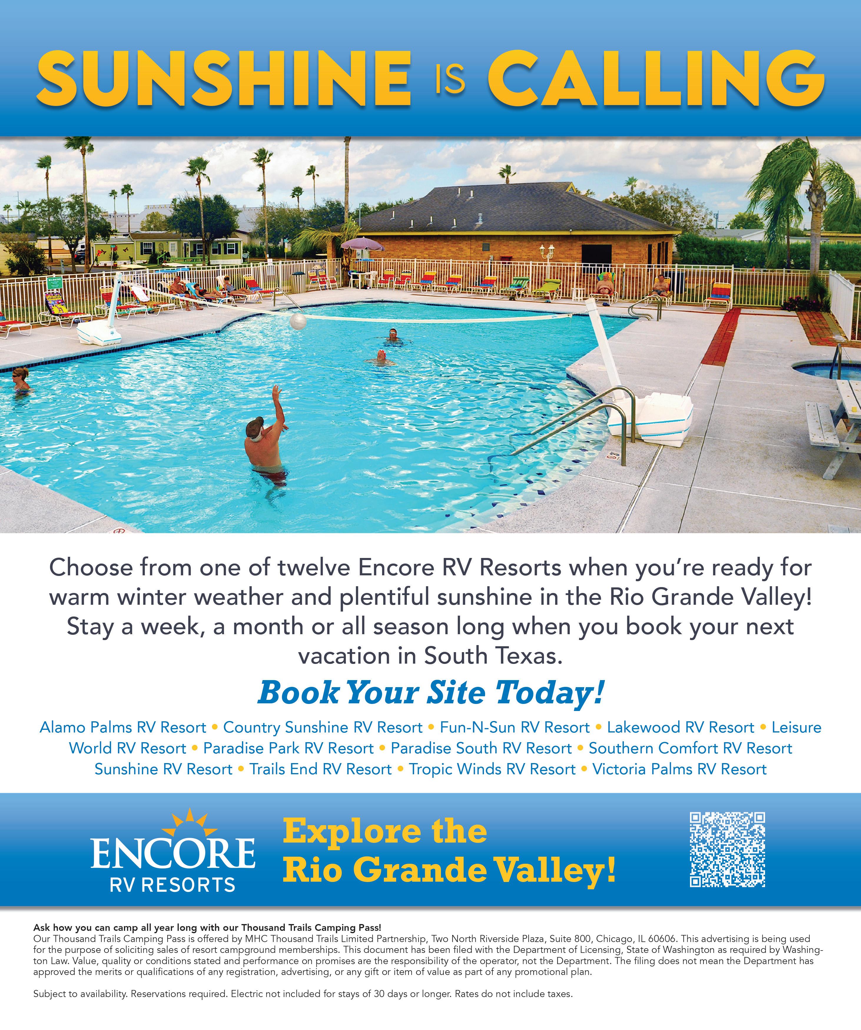 We are excited about this season, the return of our Winter Texan friends, and the opportunity to meet those of you who are first timers in South Texas. Each week, we look forward to publishing this newspaper, packed with events, entertainment, and more to keep you as busy as you want to be! All the information you will find in the pages that follow have been collected from RV resorts and community organizations from across the Rio Grande Valley, and we encourage you to get out there and explore our wonderful Valley. All the events and activities can also be found on our mobile app, which is handy because the app will give you directions, too!