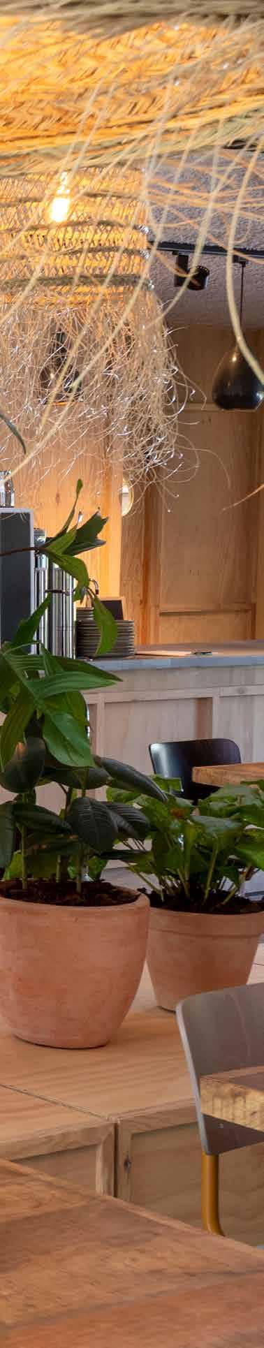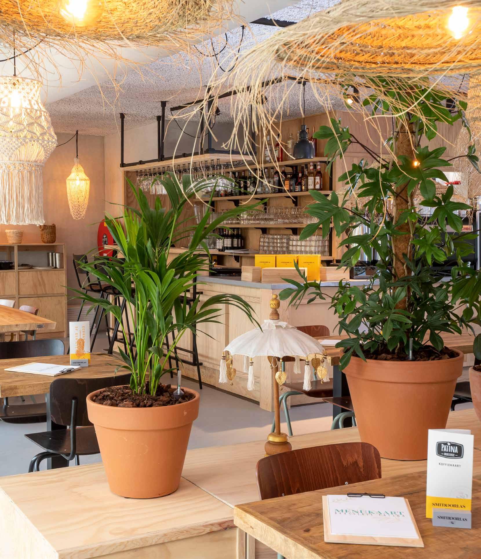 Wanneer wij de brasserie binnenstappen, is er maar één woord dat wij kunnen gebruiken om het interieur te beschrijven: wauw. Wat is deze locatie prachtig vormgegeven! De bar is handgemaakt van natuurlijke materialen, net zoals de lampenkappen van zeegras. En de vrolijke stekjes van subtropische planten maken het helemaal af.