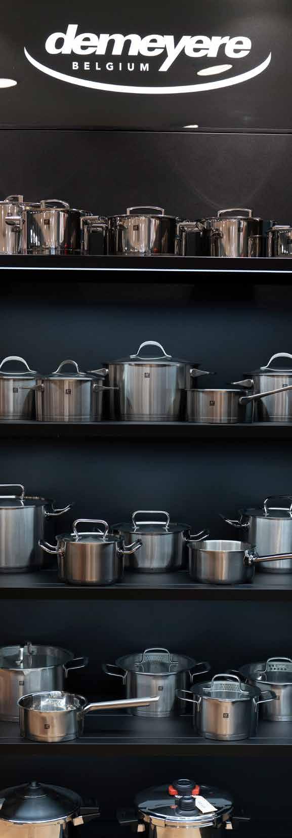 Waar je in andere kookwinkels bijvoorbeeld veel displays en stellages met merknamen vindt, vind je dat niet zo snel terug bij Van Erp. Op één merk na: Demeyere. “Dat is ons best verkochte merk,
