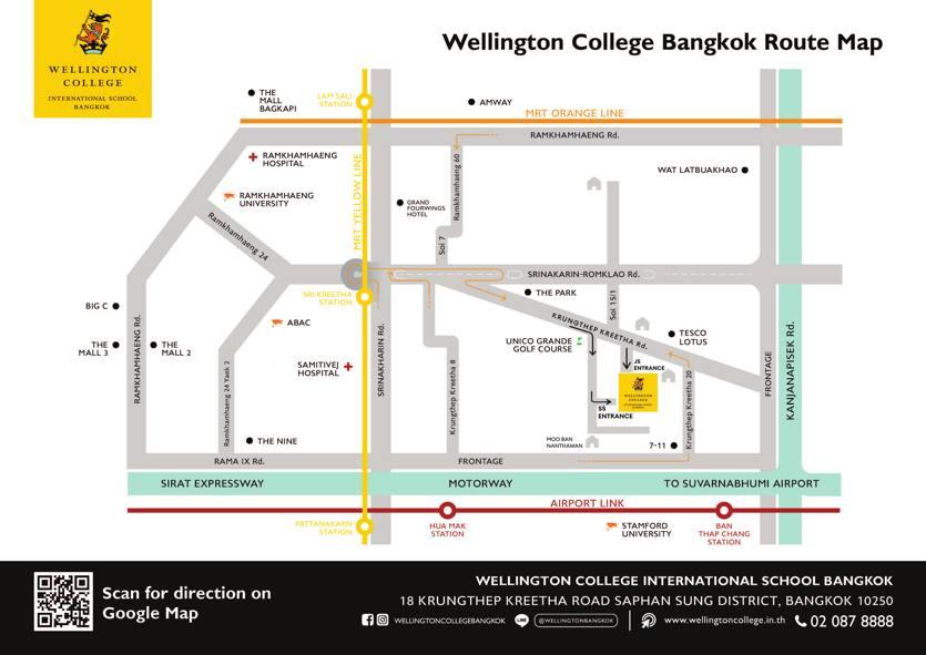 Wellington College is located in the Krungthep Kreetha area of Eastern Bangkok, at the midpoint between Bangkok City Centre and the Suvarnabhumi Airport (BKK). It is situated on 70 rai (28 acres) of lush green land with a lagoon and expansive recreational space.