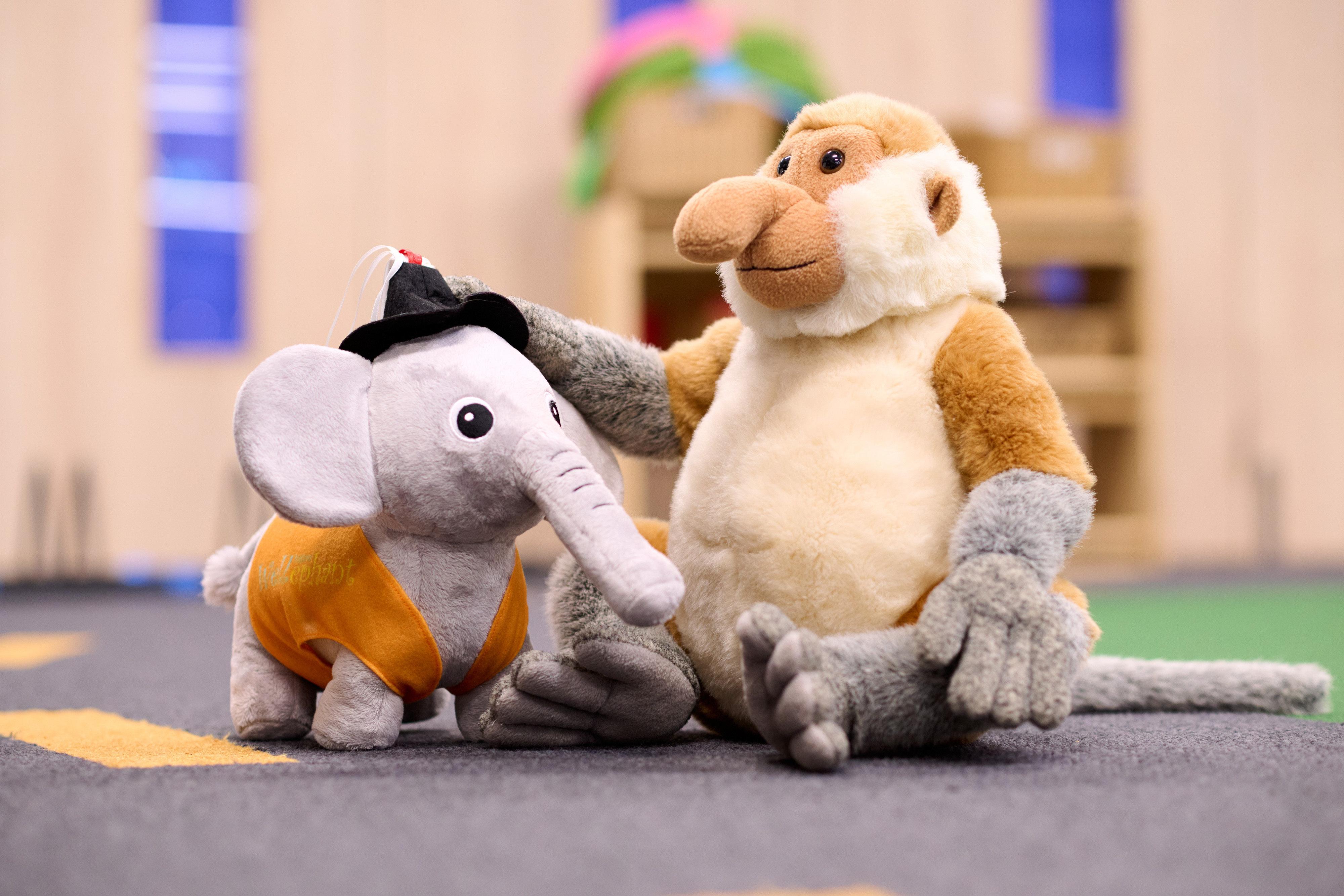 While playing, Wellyphant slipped and grazed his knee. He let out a soft whimper, trying to be brave. Ms Monkey rushed to comfort him with a hug and a band-aid, reassuring him with gentle words "You will be alright, Wellyphant".