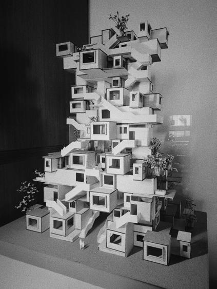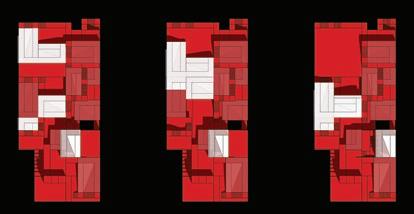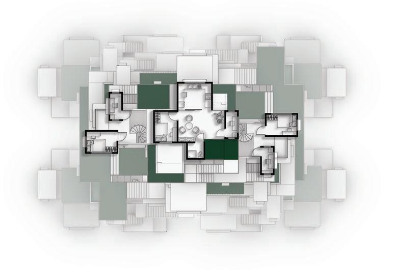 GROUND FLOOR 1st FLOOR 2nd FLOOR 3rd FLOOR 4th FLOOR 5th FLOOR 6th FLOOR 7th FLOOR 8th FLOOR MEGA VOID 3 2 2 3 1 2 3 1 1 1 1 1 1 3 Cluster A’ = Cell 1+2+3 Cluster C’ =Cell 1 (mirrored) +2+3+1 Cluster C =Cell 1+2+3+1 A’ C C’ Cluster A’ Con guration Circulation between Two Clusters Final Aggregation Strategy Peck Seah St. parking N Passengers and residents could walk through the tower via the cross-shaped paths. e intersection area features a triple-volume space. From there looking up, passengers would see layers of housing units unfolding. Front entrance Back entrance Triple volume entrance 0 10 m SCALE BAR 1:100 5 1 2