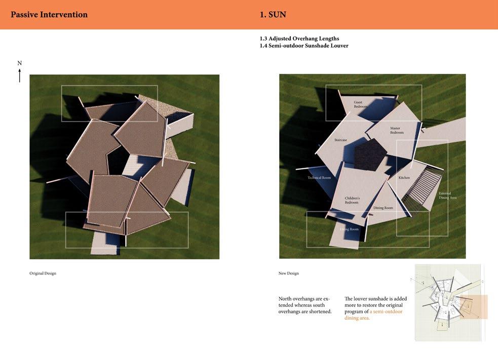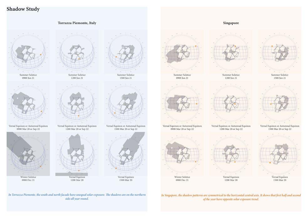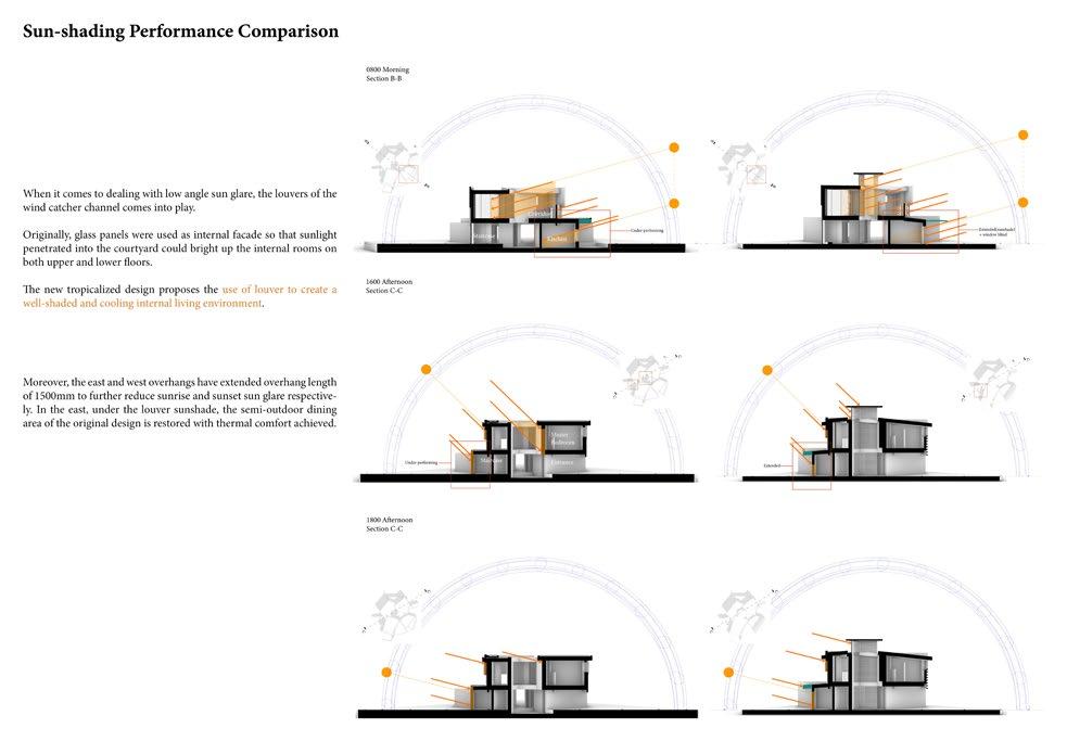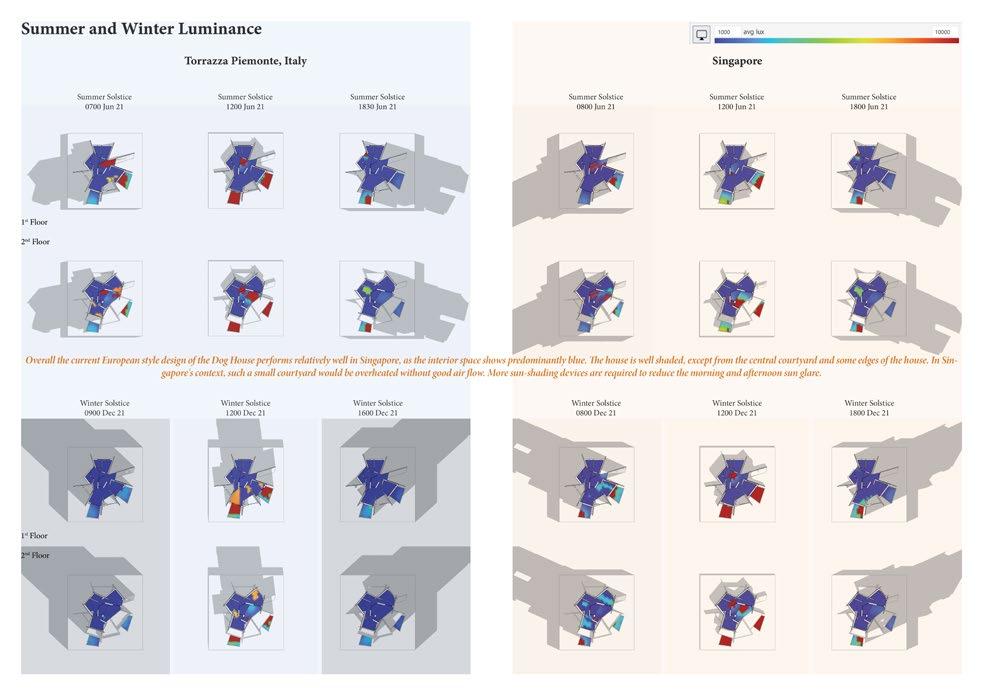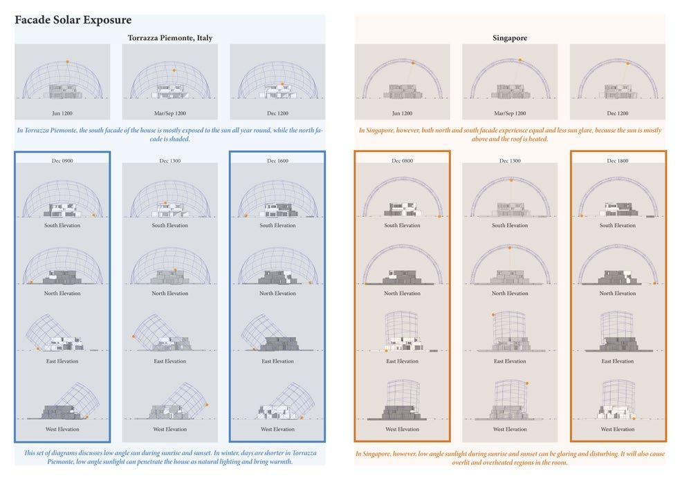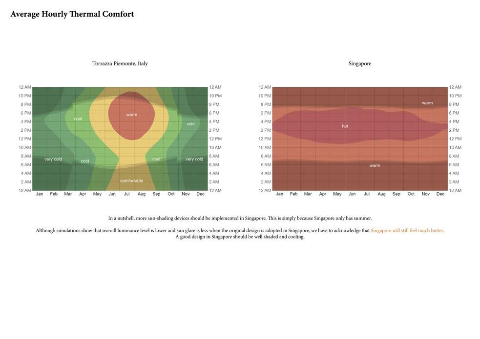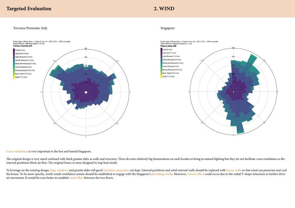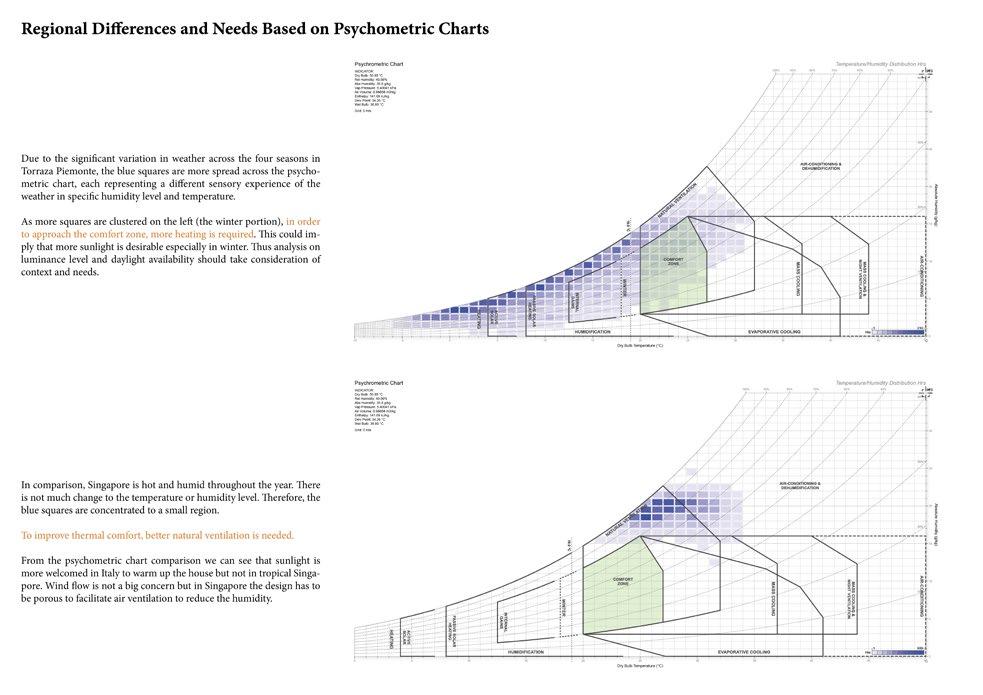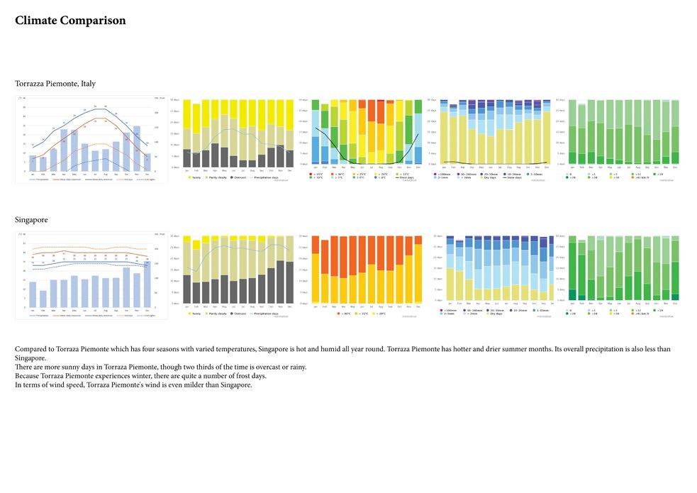 本次欧洲住宅的热带化改造项目,是“气候、生态与建筑”专项研究课程中的任务之一。该项目侧重于以气 象数据分析为导向的被动式设计,即顺应自然界的阳光、风力、气温、湿度等自然原理,尽量不依赖常规 能源的消耗,以实现最佳的热舒适度,并在最大幅度上降低额外的供暖、空调、照明等需求。由于篇幅限 制,本作品集摘录了此次研究项目的部分汇报内容。完整报告共分为三个章节:第一章重点研究了原设计在 意大利人文与气候背景下的设计意图和使用效率;第二章从日照情况(时长、强度、路径)、季节性风向风 力变化以及降雨量分布等角度对新加坡和意大利的气候进行了深入而具体的比较分析,结合湿度温度对 照图的分析结果确定改造内容;第三章作为最后一章承接上文、前后呼应,依照光、风、雨的顺序介绍了改 造后的热带化设计,并与原设计进行了各方面的比对,保证其既保留了原本的结构和风格,又能在适应本 地热带气候并发挥优良性能。本次研究课题充分锻炼了辩证与批判性思维、数据分析技能以及新软件的 快速学习与应用能力,培养了对环境设计的敏感度,为后续绿色低碳建筑设计学习奠定了坚实基础。