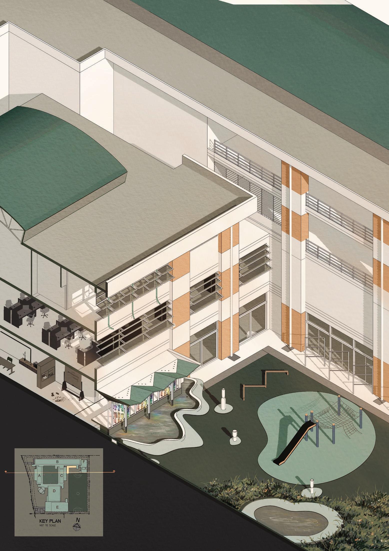 In Design 4, under the big theme of environmental design, building facade, as an architectural interface between shelter and the natural climate, is first studied and understood in sectional layers to achieve microclimatic performative results. Inspired by David Orr on the theory of architecture as pedagogy, this project added value by exploring the possibility to integrate teacher’s apprentice with facade design such that architecture is able to perform, curate, express, narrate, foster and engage users or to be more case-specific, primary and kindergarten students of Jurong West Primary School.