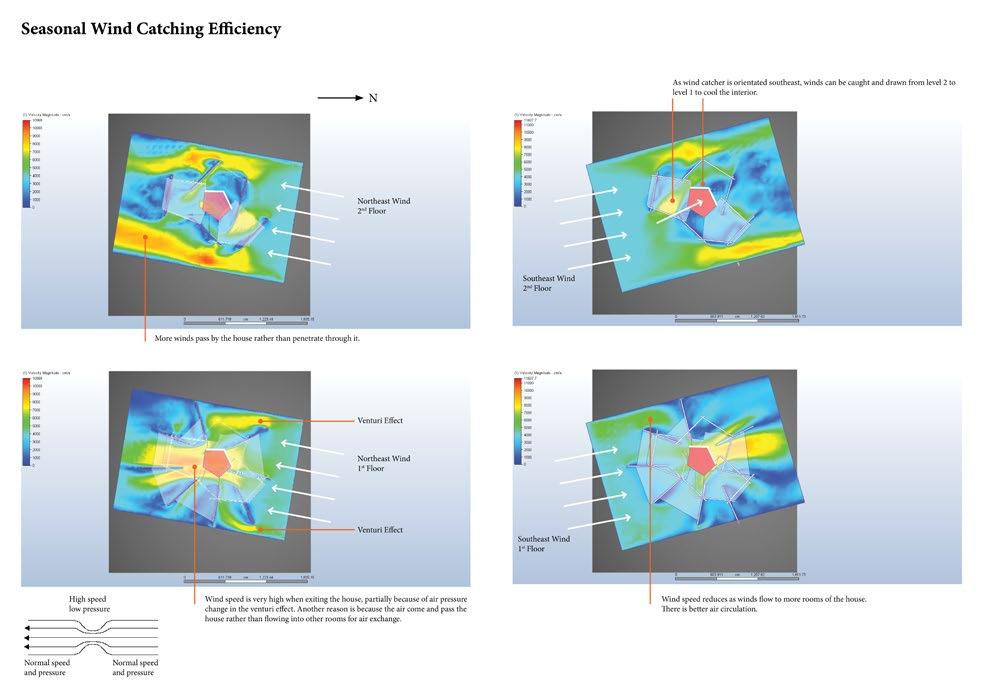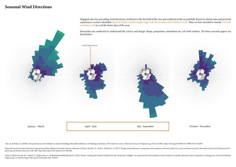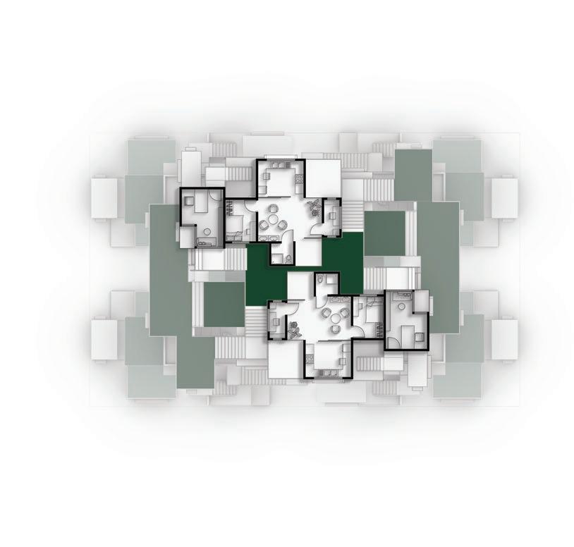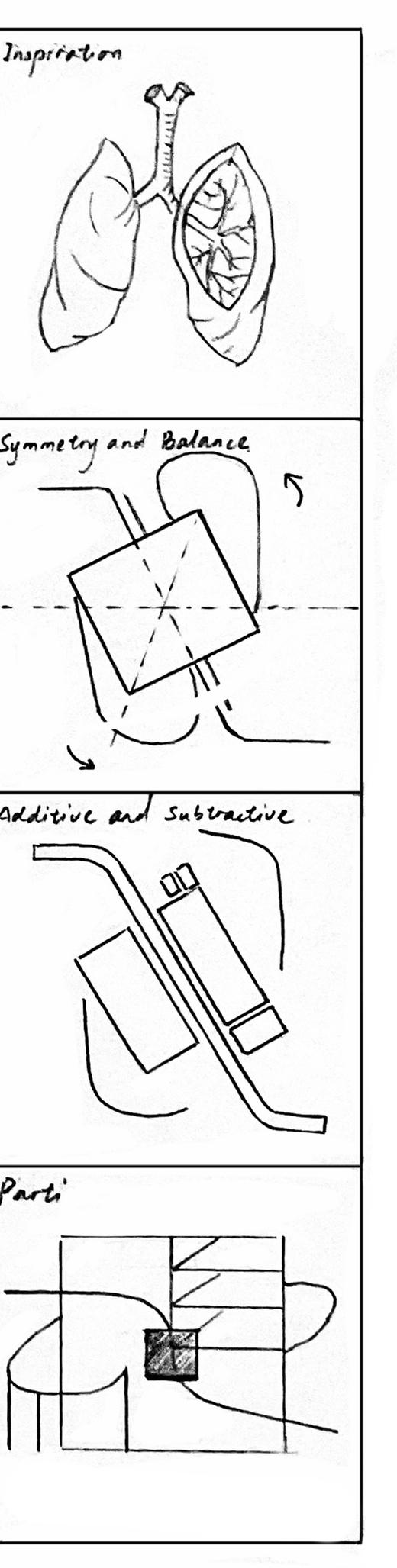 该提案通过对人体工学的研究,在设计中充分考虑人体活动尺度并尝试了大量的空间整合方式,首先优选 出三种具有半开放空间的单元模块类型;而后在模块的进一步排列组合中兼顾空间结构的高效性与功能 动线的合理性,不断优化改进,最终形成了一座近40米高、X形旋转对称的集合住宅楼,并在其27户单元模 块中包含了一组茶室和微型书屋,均可通过三层的中央空中公园步行到达。总体来讲,“城市呼吸”体现了 对气候和场地条件的综合性考量和批判性回应,最大程度地增加了绿色公共空间以加强邻里互动,以求 在高楼耸立的城市中心营造一片绿洲,重现甘榜时代居民之间那种肝胆相照、守望互助的友爱精神。