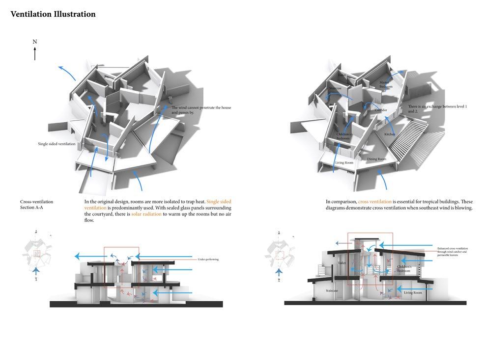 The project, titled ‘Tropicalization of the House of Cards,’ forms one of the three exercises within the supplementary architecture module ‘Climate, Ecology & Architecture.’ This module places a strong emphasis on climate-informed passive design strategies to achieve optimal thermal comfort. The subsequent pages are extracted from a comprehensive report, organized into three chapters. The initial chapter focuses on understanding the original design intention and efficiency of the House of Cards in the context of Italy. The second chapter involves a comparative analysis of climates between Singapore and Italy, considering aspects such as sun, wind, and rain. The final chapter introduces a modified design that preserves the original structure and style while adapting seamlessly to tropical weather conditions. The project showcases analytical capabilities, critical thinking, and proficiency in software, particularly the use of ClimateStudio for justifying design effectiveness and meticulous attention to detail.