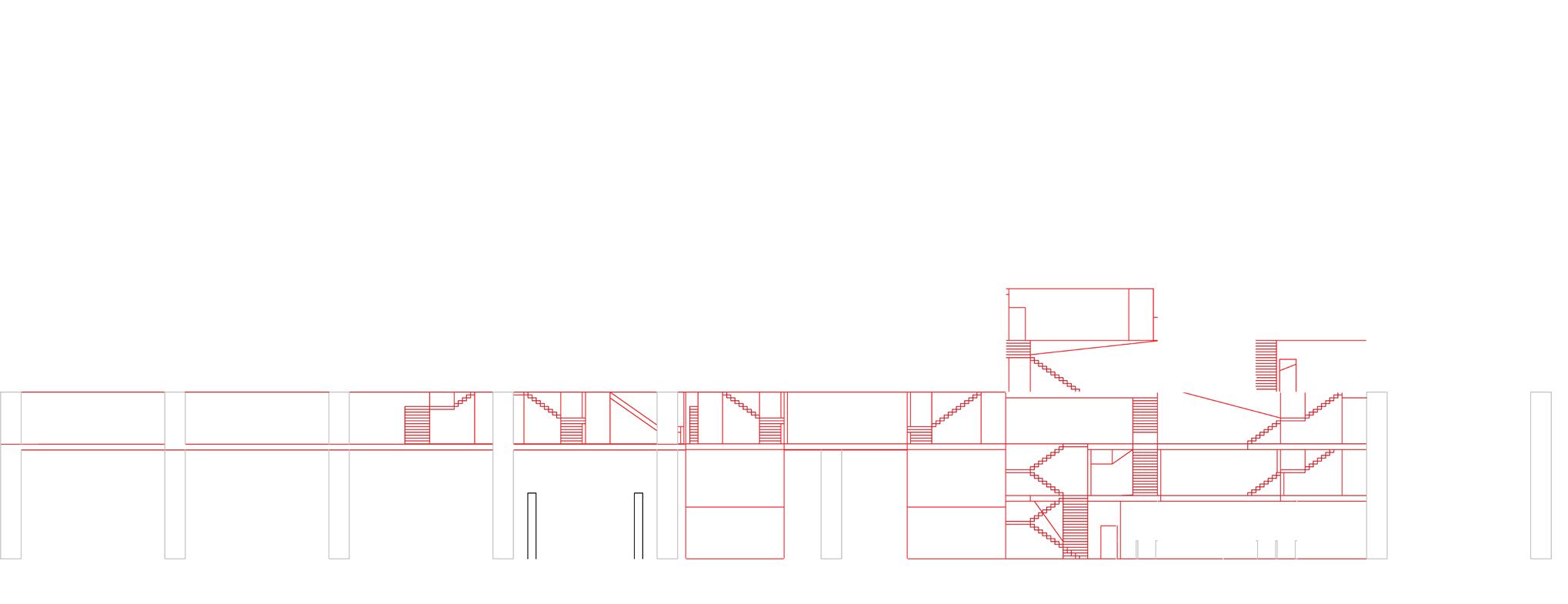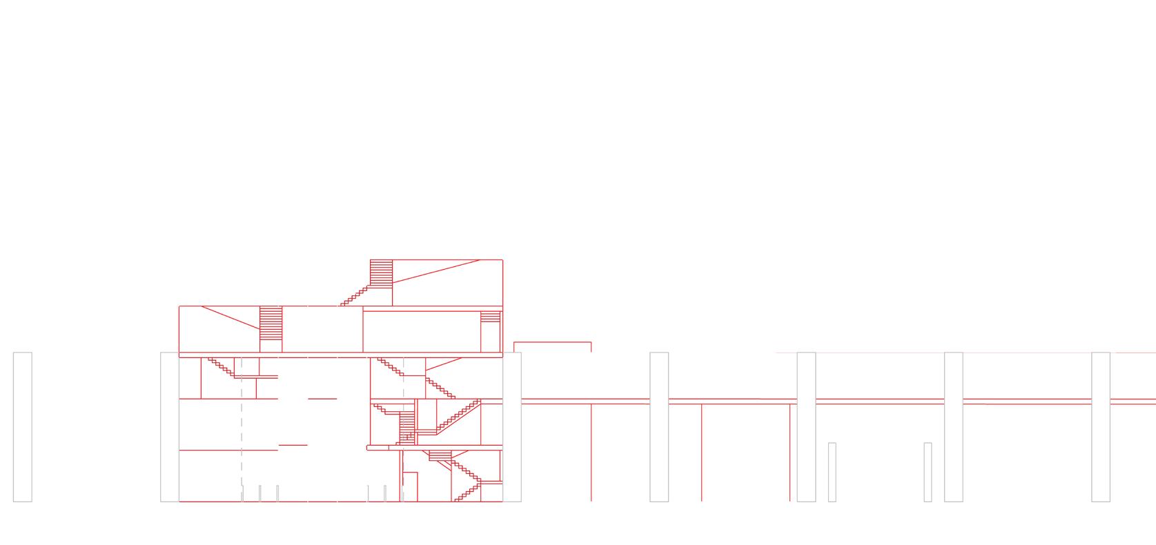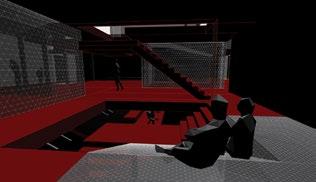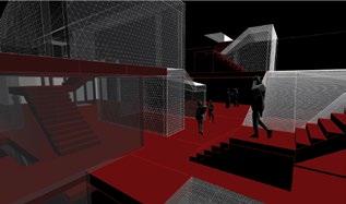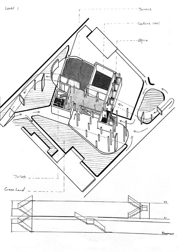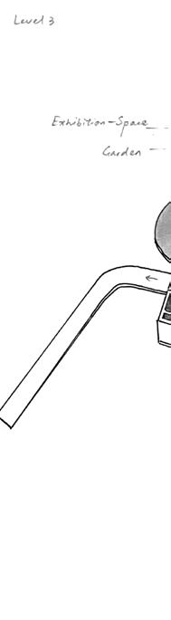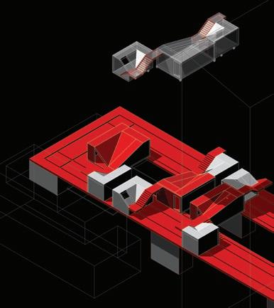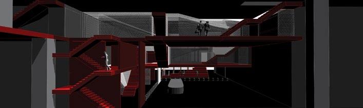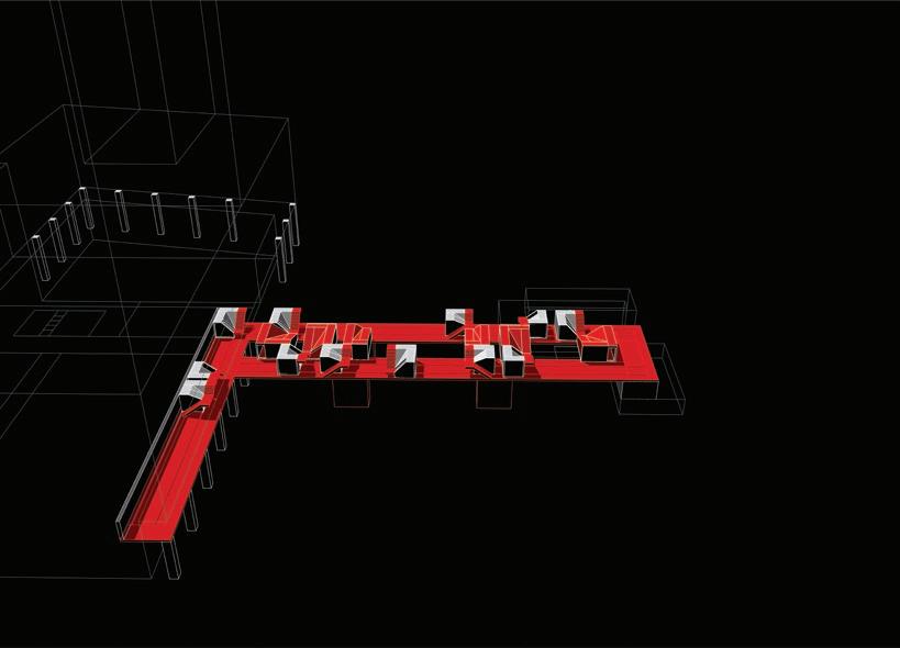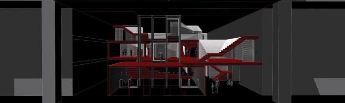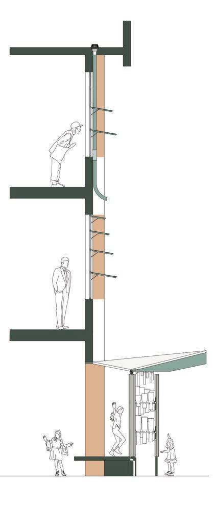 SOUTH ELEVATION SCALE 1:100 DEFAULT MODE NE ISOMETRIC VIEW SCALE 1:100 Recon guring the initial overhang, a platform is fashioned to reach the previously inaccessible garden. e choice of building material prioritizes durability, lightness, and waterproof characteristics to suit the outdoor setting and provide adequate structural support. Internally, the aim is to preserve the passageway's luminous and transparent aesthetic. Modular rooms are constructed using glass panels supported by metal mesh for structural integrity and privacy. e design prioritizes enhanced interconnectivity within this shared space. In the outdoor setting of the transitory system, durable and lightweight materials are ideal for the modules, allowing for exible programming. e modules can be combined in various ways, with a weekly changing layout to create visual interest, attracting footfall for events, exhibitions, and sales. During the night, this "bridge" transforms into an ideal performance stage. Additionally, individual groups can book the space for co-working purposes. To minimize congestion in the use of li s, a strategic approach is implemented. Li 1 stops at the new Level 2, Li 2 stops at the new Level 3, and Li 3 goes directly from Level 1 to Level 4. LIFT 1 LIFT 2 LIFT 3