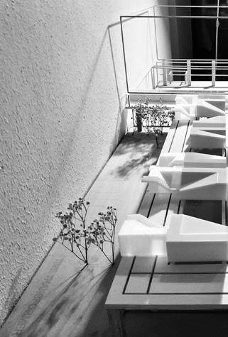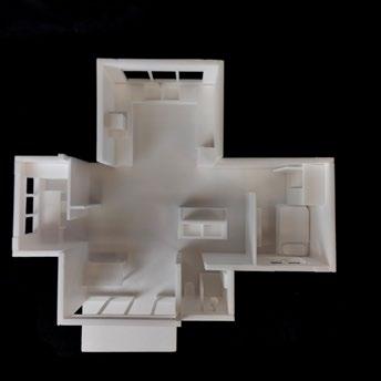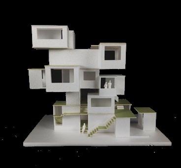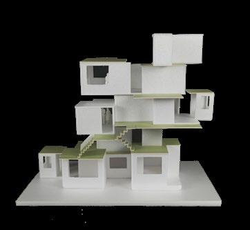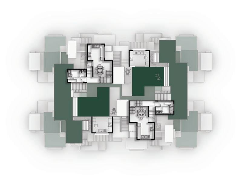 TOP Solid Void Circulation FRONT SIDE Void Void Void Tower Information Number of Housing Units: 27 • 11 Cell Type 1 • 8 Cell Type 2 • 8 Cell Type 3 Height: 38.7 m e starting form is a 20 x 30 x 40m 8-storey high block de ning the boundary and limits of this project. e block is divided into four quadrants based on site analysis. To facilitate prevailing wind, quadrants A and C are lowered to created two big voids in the tower. is also reduced heat at C. As the site is mostly under shadow, lighting at lower oors is a concern. erefore, the tower is terraced, creating a cross-shaped void space in the middle. A, B, C and D leaning towards the center also generates tension and structural support. A B C D D B C A A B D C N