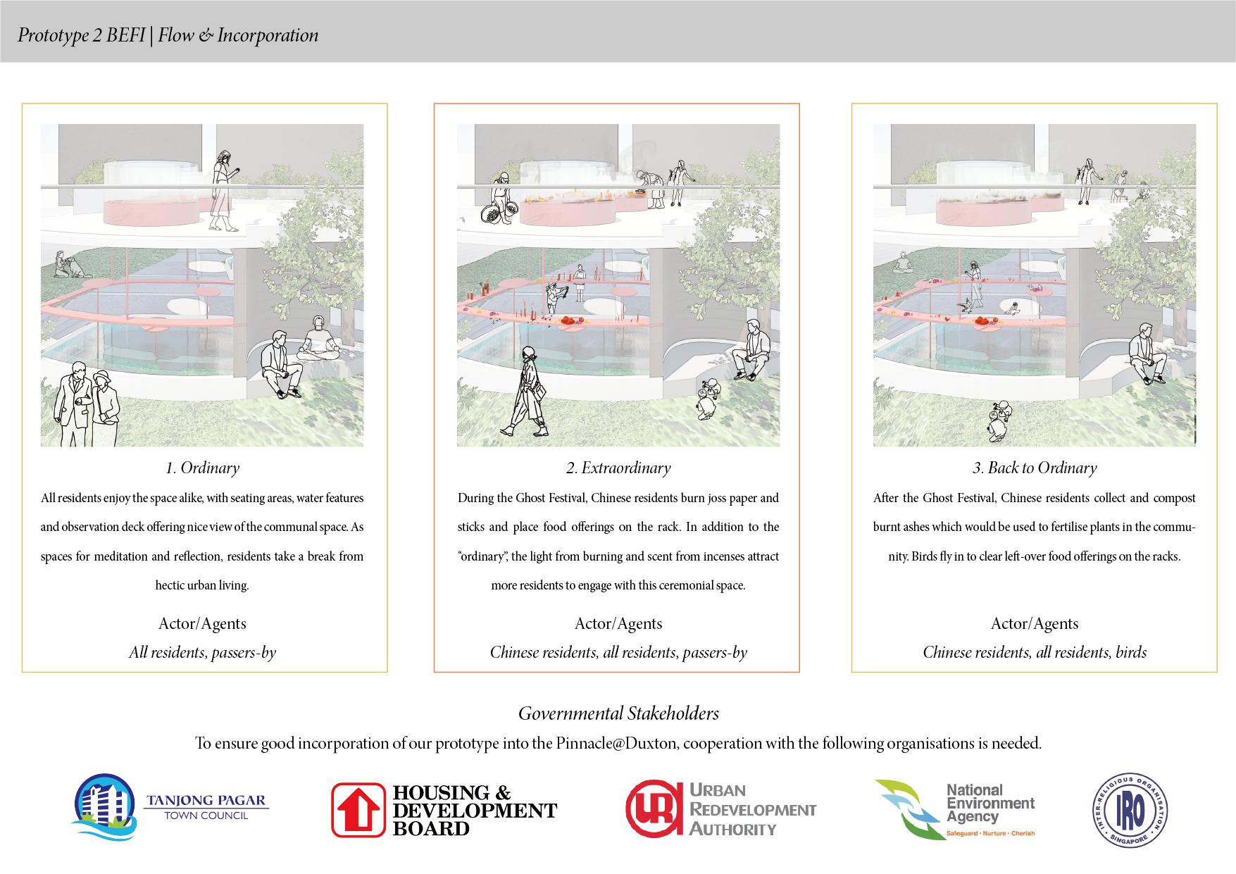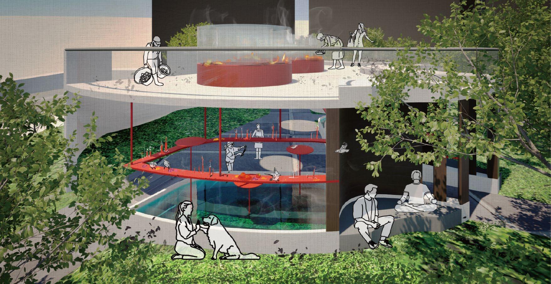 其中,“文明祭祀公共设施”这一提案在民俗文化领域重点关注了新加坡住宅区内的燃香烧纸的问题。该 提案经过深入调查,充分理解烧纸作为传统祭祀行为背后重要的内涵和意义,同时对其带来的环境污染 和潜在社会问题作出了客观评价。利用烧纸行为周期性的特质(主要发生在清明节前后)以及对公共空间 使用规划的理解,最终版方案设计了一个双层复式多功能空间,方便过滤吸收烧纸所带来的烟尘,并且可 以作为人工自然景观,在一年中的其他时间段展现不同的功能和状态。值得一提的是,本次设计在材料选 择等方面注重环保和可持续性,同时在功能方面考虑到人类以外的用户需求及利益(例如鸟类喜欢吃祭 品、树木怕热喜温),有助于促进人与自然的和谐共处。