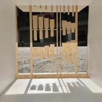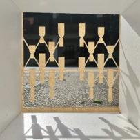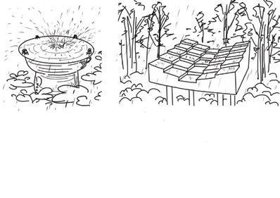 Add di erent amount of water to a set of glass cups. e more water added, the lower the pitch. Tuning by adjusting the water level. • Tabbing the side of the glass cups will generate “water xylophone”; rubbing the wet nger around the rim of a glass produces an ethereal tone, creating a “glass harmonica”. Vibration, Frequency, Resonance, Pitch Music is created by glass cups containing water due to resonance. Resonance in physics is a phenomenon in which an external force or a vibrating system forces another system around it to vibrate with greater amplitude at a speci c frequency of operation. Factors that a ect the tone and pitch of the glass: the quality of glass, its thickness, its shape, and amount of water inside. Glass cup with less water will produce a higher pitch. Rounded glass with bigger openings creates better sound quality. Rectangular shapes tend to produce more complex harmonic spectra because of their irregular and uneven surface areas. Glass cups can be rotated to discard water or change to an other section with a higher pitch. Seven glass cups are designed as one set to give seven musi cal notes (from right to le , do, re, mi, fa, sol, la, ti) in two sections. Only one end of the glass can be hold or supported so that the vibration and the sound quality would not be a ected. us, the “one up one down” composition is invented with two glass cups joined together and supported at the solid middle part to balance the weight. Rainbow (seven) colors could be used to help children recognize the each musical note. λ/4 5λ/4 3λ/4 1 Resonance 2 Resonance (third harmonic) 3rd Resonance ( h harmonic) Vibrates faster Higher pitch 1 2 3 4 5 6 Rain chains are a decorative, functional alternative to downspouts. ey beautifully move rainwater from gutters to drains. Harvesting or collecting rainwater Directing the water ow using a series of connected cups or channels Dispersing the water into a collection or storage system e rain collection roof could be at or has a downwards or upwards slope. ese three pro les have di erent sun-shading e ectiveness. While an upwards slope invites more sunlight and reduces less sun glare on sunny days, it can work better on rainy days for rain harvesting. All the rainwater will be directed to the pipes and ow into the glass cup instruments, with no extra chain of rain generated along the roof edge. Children can be better protected from the rain. Another layer of music could be added by changing the roof to a hollow material so as to simulate sound of a the rain drum. Rainwaves by Studio Vallbo used steel to create 25 rain drums with di erent tones. Rainwater that over ows could also be used to water plants in the little garden.
