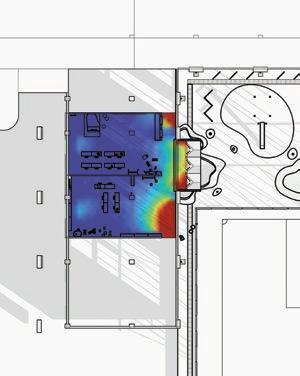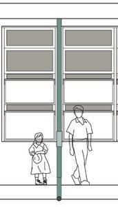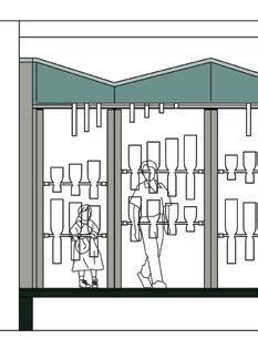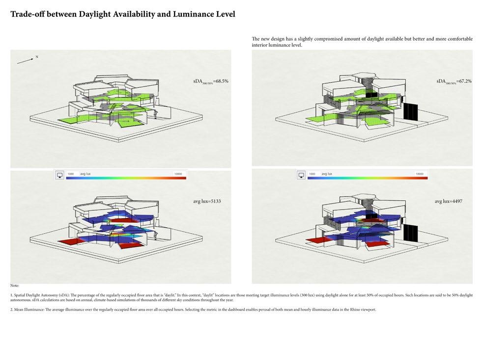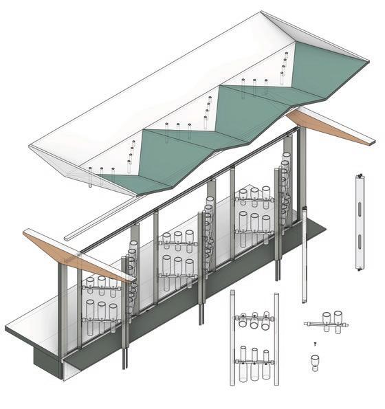 is project aims to address two challenges: the intense morning glare lasting for three hours on sunny days and the dullness of rainy days. e proposed solution is a facade design that creatively manages sunlight to provide shade and visual interest, while also incorporating rainwater collection and playfulness through the use of musical glass rain chains. Vernal Equinox 09:00 Mar 20 Vernal Equinox 12:00 Mar 20 Spatial Daylight Autonomy e percentage of the regularly occupied oor area that is “daylit.” In this context, “daylit” locations are those meeting target illuminance levels (300 lux) using daylight alone for at least 50% of occupied hours. Such locations are said to be 50% daylight autonomous. Mean Illuminance Simulation e corridor functions as a bu er against sun glare, but the level one oor-to-ceiling windows necessitate shading devices. Installing the musical glass facade and a 2.5-meter rain collection roof further decreases interior illuminance. 3000 mm 1400 mm 500 mm 1500 mm 300 mm An additional dark colored membrane is installed onto the existing glass window, with gap between the two layers. e membrane is level with the window frame to ensure at surface and prevent rainwater from accumulating. When it rains, the membrane is like a drumhead, creating a soothing sound reminiscent of a rain drum. Existing top hung window frame Double glazed glass e window grid is designed to gradually increase in size as it goes down four rows, creating a terraced pro le. is design allows for rainwater owing through the down pipe to cascade from top to bottom, generating soothing sound and providing an interesting visual e ect. larger windows at the bottom of the grid ensure unobstructed views. e down pipes of the rainwater harvesting system are designed to be rotatable water spouts. is allows children to adjust the direction of water ow and play with the falling rainwater during rainfall event. e musical glass facade is elevated by 500 mm to create a stage and cozy reading/play area. To avoid obstructing the corridor, it is also pushed out by 1000 mm. All design elements take into account the height of both kindergarten and primary school students. Corridor KindergartenClassroom Sta Room ArtandCra Room VideoEditingRoom WaterPlaygroundandEcoPond Corridor Kindergarten Students (ages 3-5) Mean Seat Height K1: 25-30 cm K2: 30-35 cm Kindergarten Students (ages 3-5) Mean Height: 90-110 cm Primary School Students Grade 1-2 (ages 6-8) Mean Height: 110-125 cm Primary School Students Grade 3-4 (ages 8-10) Mean Height: 125-140 cm Primary School Students Grade 5-6 (ages 10-12) Mean Height: 140-140 cm