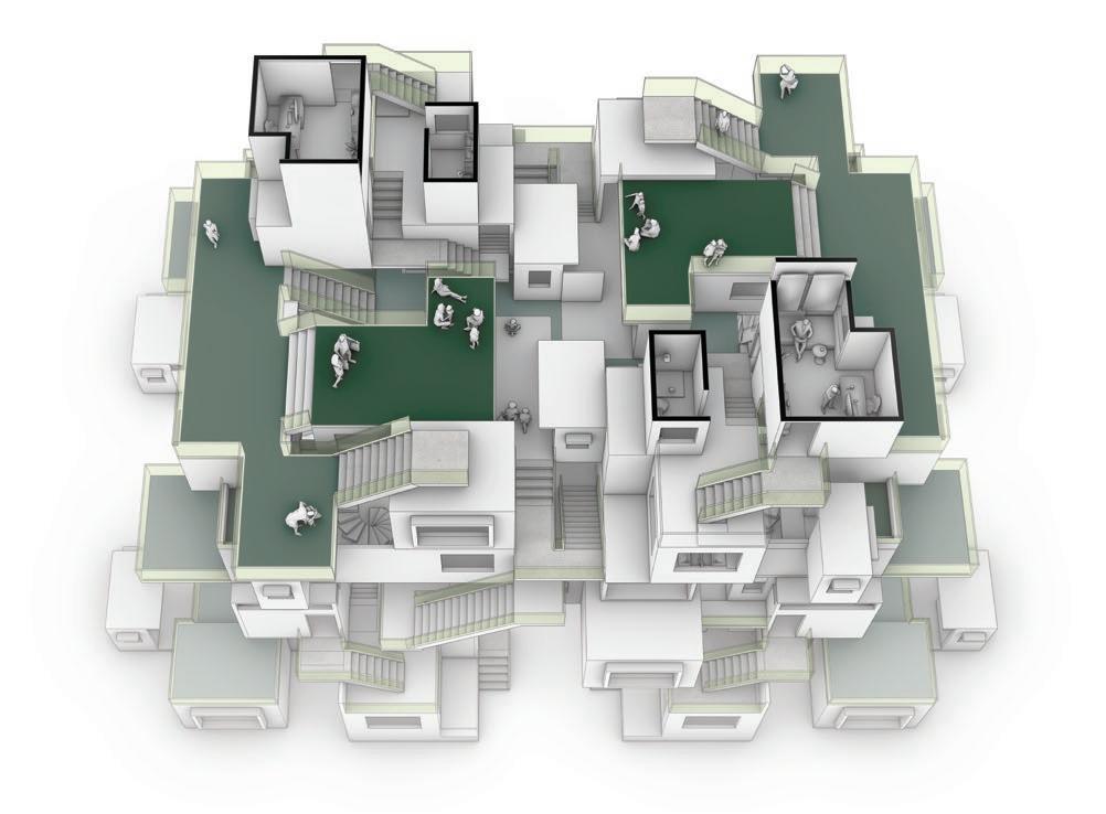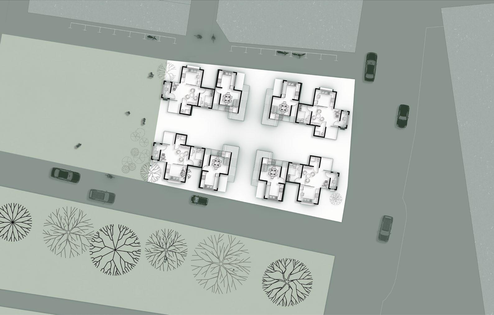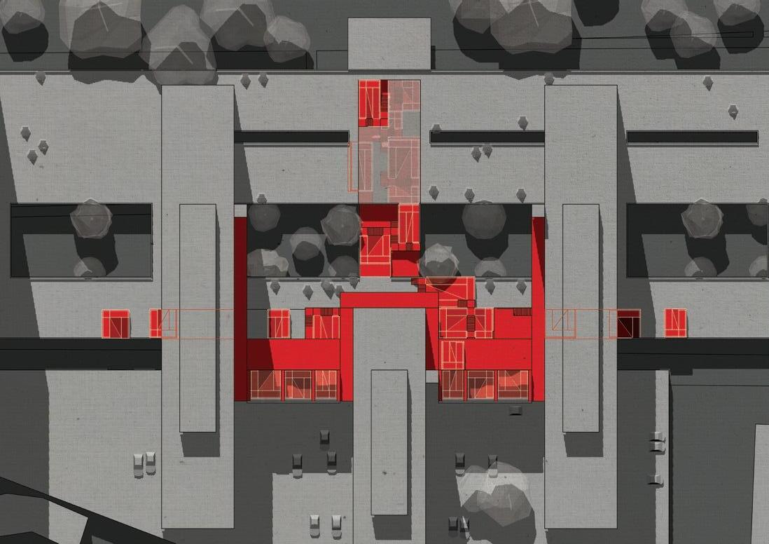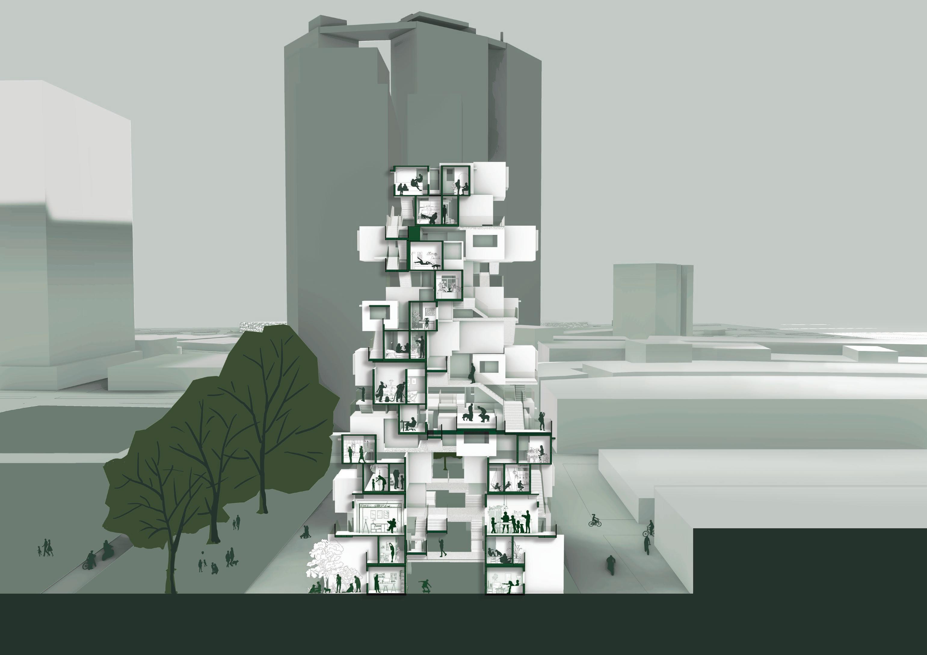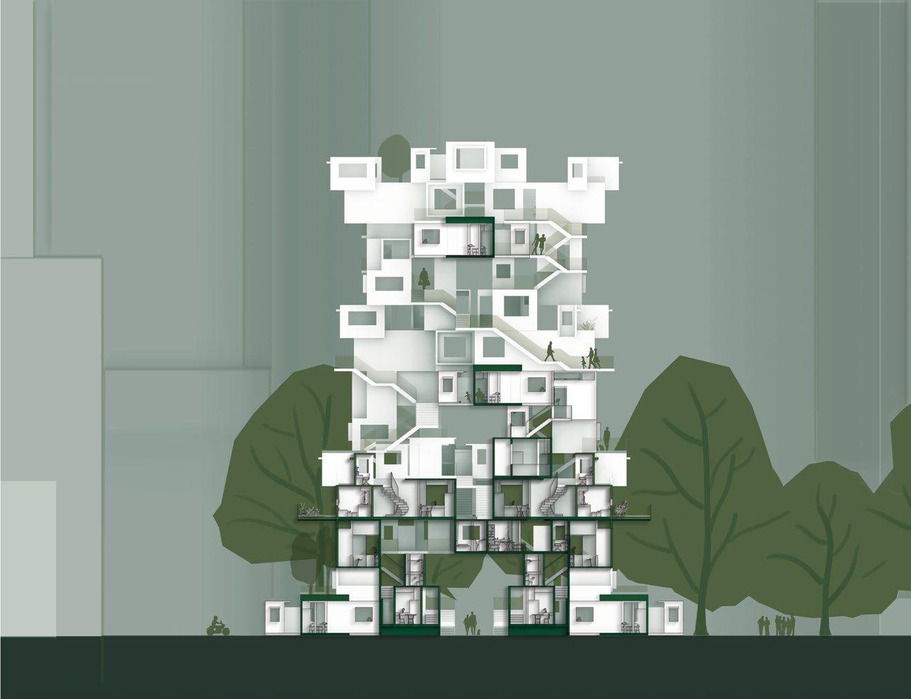 Design 3 seizes the collective dwelling building project as an opportunity to introduce modular aggregation as a key design strategy. From micro (housing unit cells) to macro (clusters forming building blocks) and eventually to the mega level, the core theme revolves around understanding the concept of “void.” In the “Urban Respiration” proposal, void is defined as flexible space connected to the external natural environment and the neighborhood. This connection, both physical and visual, addresses the crucial need for interaction between individuals and nature, as well as among different social groups, particularly in the challenging context of pandemic lockdowns.