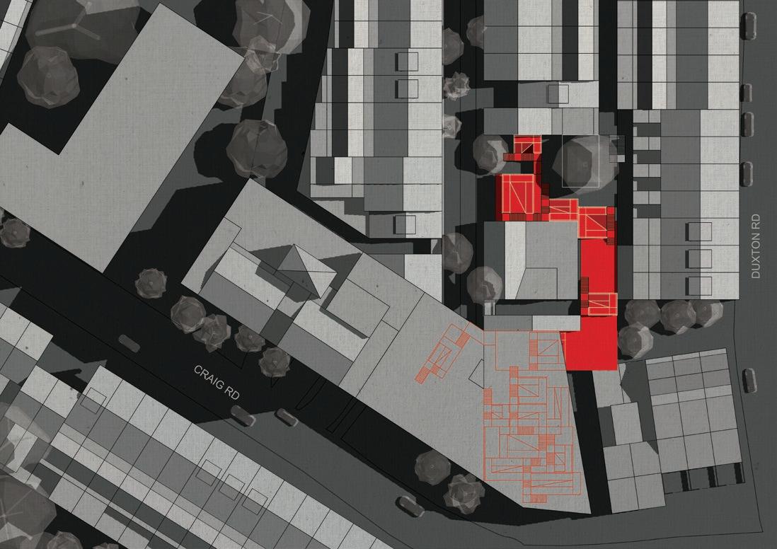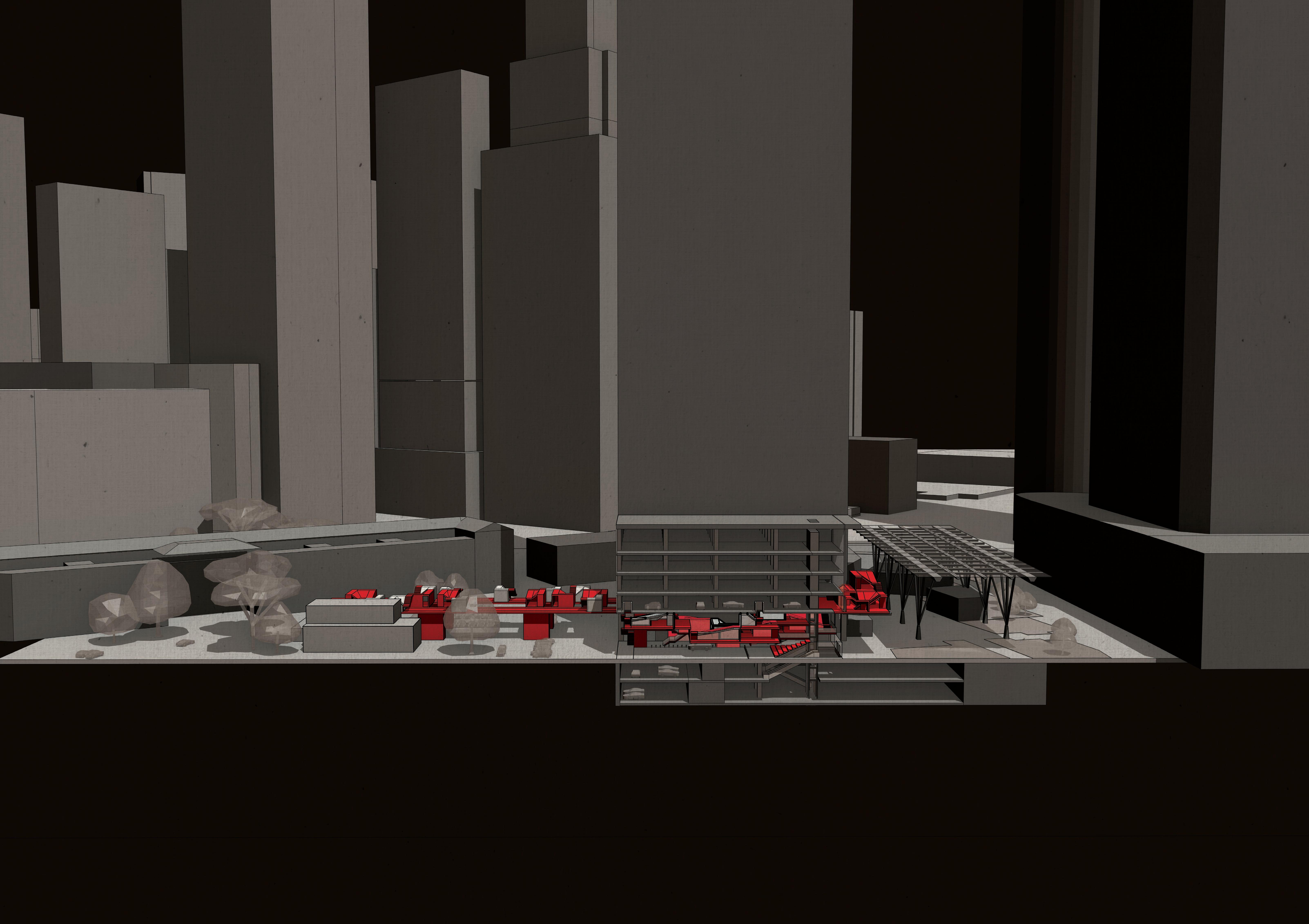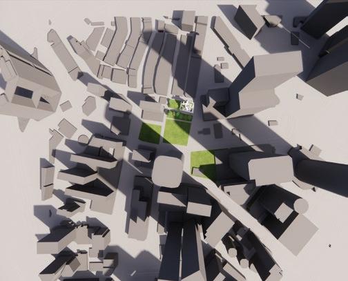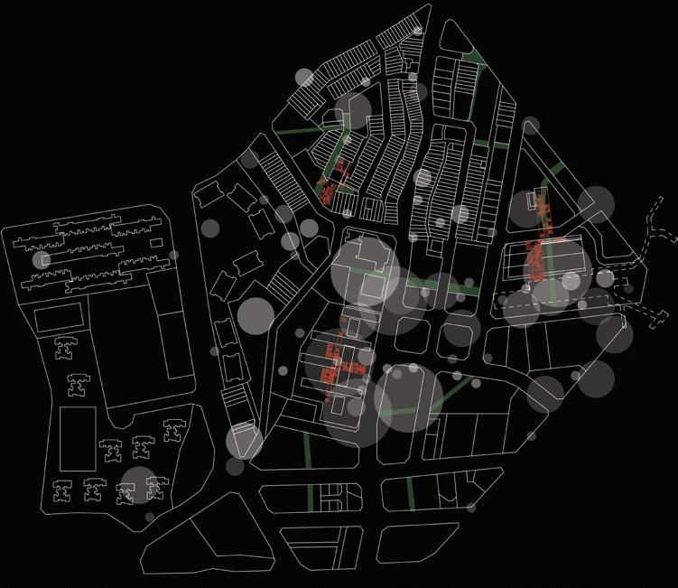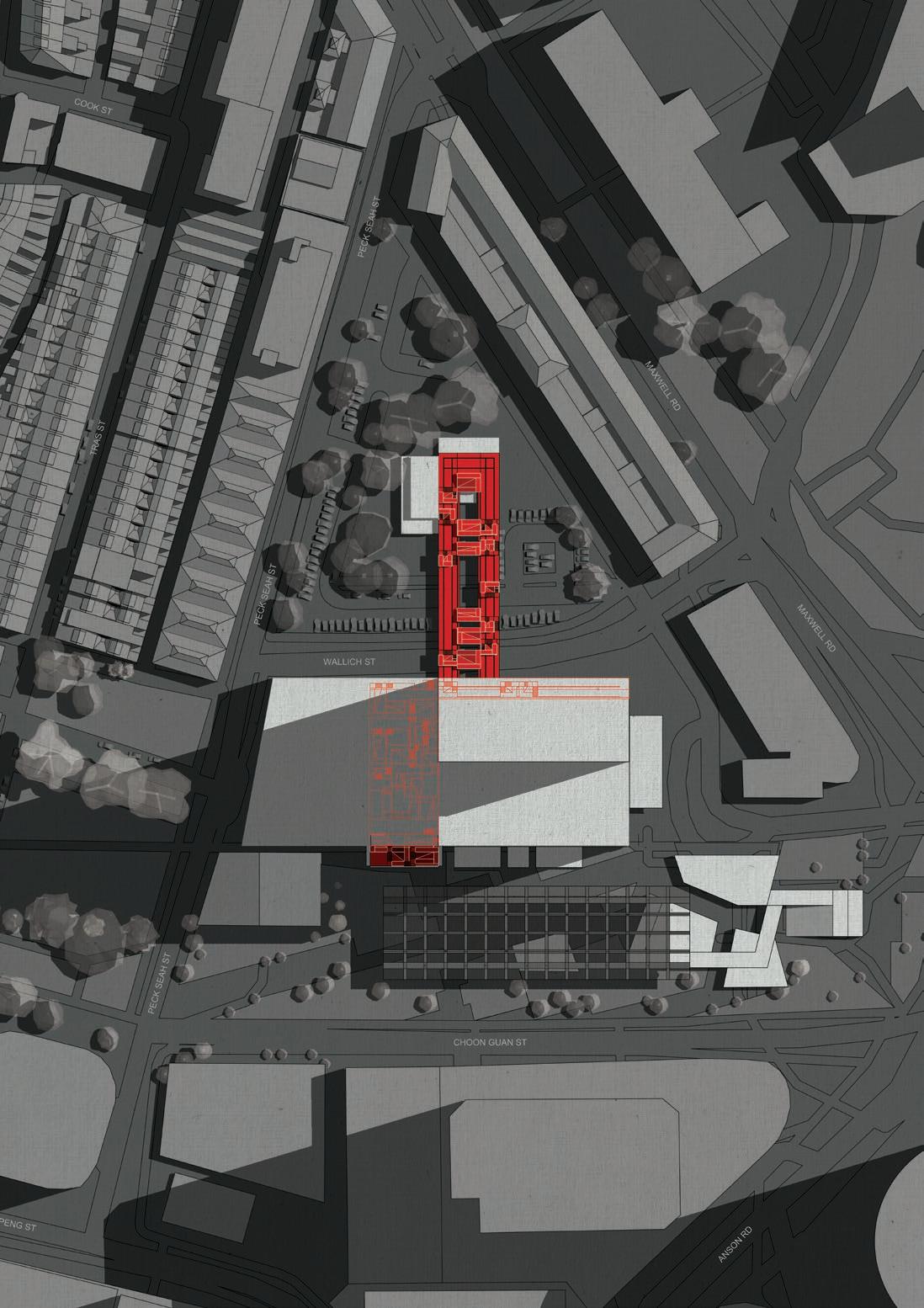 0 5 10 20m SCALE 1:500 0 5 10m SCALE 1:250 0 5 10m SCALE 1:250 External Site Consideration @Maxwell Carpark is open car park experiences high utilization, primarily by visitors frequenting the nearby restaurants in the adjacent shophouses. Despite the presence of a tness center and a cafe, they are somewhat overshadowed by the dominant car park function, receiving minimal foot tra c. Tra c congestion is a common issue, with people o en resorting to jaywalking across the road from the Guoco passageway to the car park. In response, the design of the 'transitory system' takes the form of an overhead bridge, aiming to address the tra c concerns and simultaneously activate the underutilized tness center and cafe. External Site Consideration @Tanjong Pagar Plaza e Tanjong Pagar Plaza is a bustling area, especially during lunch hours. However, on-site observations reveal that most visitors prefer walking along the street and accessing retail shops from outside, with minimal use of the main entrance, except for residents. e existing main entrance appears outdated and dimly lit, featuring a staircase leading to an underutilized second oor. ere is signi cant potential for redevelopment, envisioning an integrated double-volume space with upgraded stationary areas to replace the current stage-like seating. A transformative aspect of this proposal involves replacing the ceiling with glass, allowing natural light to ood in, and presenting an opportunity to establish access to the level 3 community void deck. External Site Consideration @Guoco Urban Park Guoco Urban Park stands out as a success story, drawing crowds on both weekdays and weekends. is adaptable space, equipped with shelter, fans, and audio facilities, proves ideal for hosting diverse events. Its strategic integration with the MRT station entrance, restaurants, and parks enhances its appeal. However, the park faces challenges, with congestion arising from the competing space requirements of restaurants and events, as well as con icting needs between transient and stationary visitors. Furthermore, in this highly commercialized area, the lack of free, self-serving spaces is notable. e proposed 'stationary system' within the passageway addresses this gap by providing a space for individuals to spend time as they wish, while also managing and diversifying the ow of people, e ectively separating transient and stationary needs. Internal Site Consideration @Guoco Passageway e current passageway, standing at 10m high, appears vacant and brightly illuminated without arti cial lighting. Despite the perception of being a wasted space, the glass-panelled li s create a visually open and interconnected ambiance, linking the underground shops. E ectively utilizing this empty space while preserving its climatic and visual qualities poses a challenge, especially in this box-like environment. e proposed design capitalizes on existing walls for structural support, introducing a system of modular spaces in glass with mesh-wrapped material. is design divides the passageway into three storeys, featuring overhead platforms that create ground space for the existing car drop-o function. Internal Site Consideration @Level 3 Void Deck e current state of the level 3 void deck reveals vast untapped potential. While a small children's playground is present near a childcare center, the lack of shelter leaves the space exposed, hot, and underutilized by residents. Even with furniture xtures under residential blocks, there is minimal usage. Interestingly, three void decks under residential blocks align, forming a linear track or suggesting a pathway. is serves as the initial implementation site for the "transitory system", fostering horizontal movement to create connections and interactions between three distinct residential blocks. Internal Site Consideration @Carpark e residential blocks are positioned above and traverse the retail space in the front, with the carpark situated at the rear. Tra c ow is somewhat intricate, given the alley between these areas, and the li of the middle residential block is positioned within the carpark. Unfortunately, residents of the middle block face challenges in accessing the community void deck due to its proximity to the carpark. As a conceptual solution to enhance mobility and space exibility, a "space li " is proposed, as the second part of the "transitory system". is innovative idea involves connecting the three li with xed modules, generating additional spaces and platforms for residents to engage in various activities. External Site Consideration @Shophouse Alleys Behind Craig Place Apartment, encircled by shophouse restaurants and bars, lies the sole paved pedestrian pathway in Tanjong Pagar. is secluded street, tranquil during the day and vibrant at night, hosts a discreet linkway staircase beneath the carpark, serving as an exit to the main road. e convergence of several shophouse back alleys, characterized by uneven typography and adorned with mature trees in the courtyard, creates intimate spaces for shophouse workers to enjoy brief respites. Inspired by this setting, the proposed "transitory system" is strategically positioned here, its track hovering above the back alleys, providing shelter and establishing a third space for these workers. Capitalizing on surplus carpark space, two storeys at the corner of the carpark are repurposed as the "stationary system," serving as an indoor garden—a shared urban living room for nearby shophouse workers to savor their precious micro rest time. TANJONG PAGAR CITY ARCHITECTURE CAPITALISM NO-STOP CITY STOP CITY FORM PROBLEM 2: Underutilized Green/Open Zones PROBLEM 3: Disorganized Transitory Areas SHARED SITE CONDITION A JUXTAPOSITION OF THE OLD AND THE NEW A HIDDEN UNDERGROUND LINK AMONG SHOPHOUSES WITHIN RESIDENTIAL BLOCKS UNDERNEATH MIX-USE TOWER BY ARCHIZOOM(1969) BY DOGMA(2005) AN UNDERUSED COURTYARD/ CORRIDOR A GIGANTIC LEVEL 1 PASSAGEWAY POTENTIAL URBAN TIME PUZZLE Single Acti