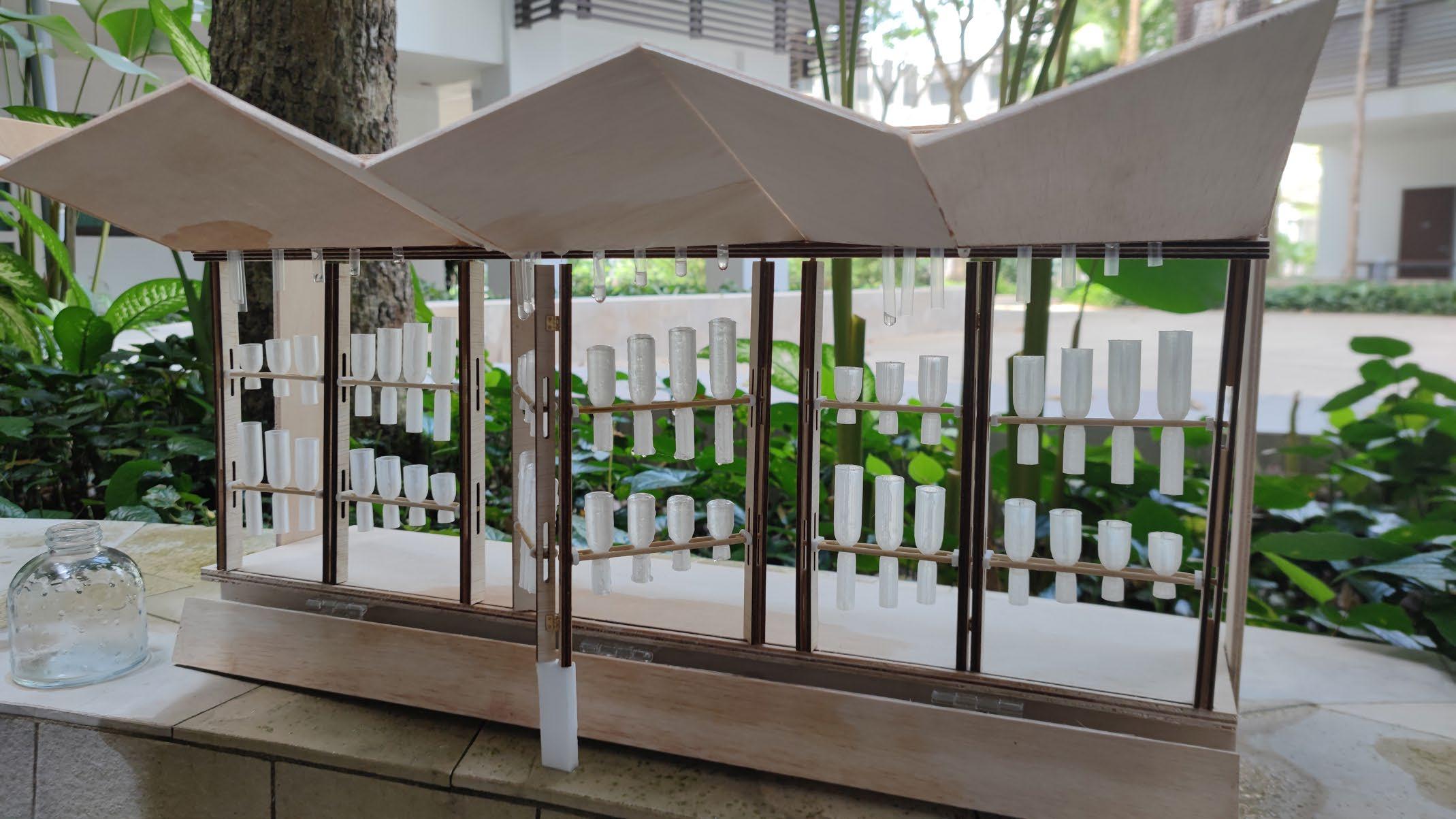 于是,“雨天狂想曲”满足了孩子们对热带雨的奇幻想象,为其精心打造了一整套由雨水激活的玻璃音乐 墙。敲击盛有雨水的玻璃外墙,就可以创造美妙的音乐。这样,雨天不再是所有阴郁的代名词。雨天,会是 游戏开启的机关,会充满欢声笑语!在从收集雨水到与水互动的每一步中,孩子的五感都将参与学习。本 项目从玻璃与水的碰撞中得到灵感,对玻璃材料颜色和纹理的遮光性能进行进一步实验探究,兼顾物理 环境层面的的宜居性和心理学角度的舒适度。同时尝试多种动态排列组合,特别关注各年级学生的身高 尺度,以达到气候调节、教学娱乐、资源节约等多层功能的高度整合。