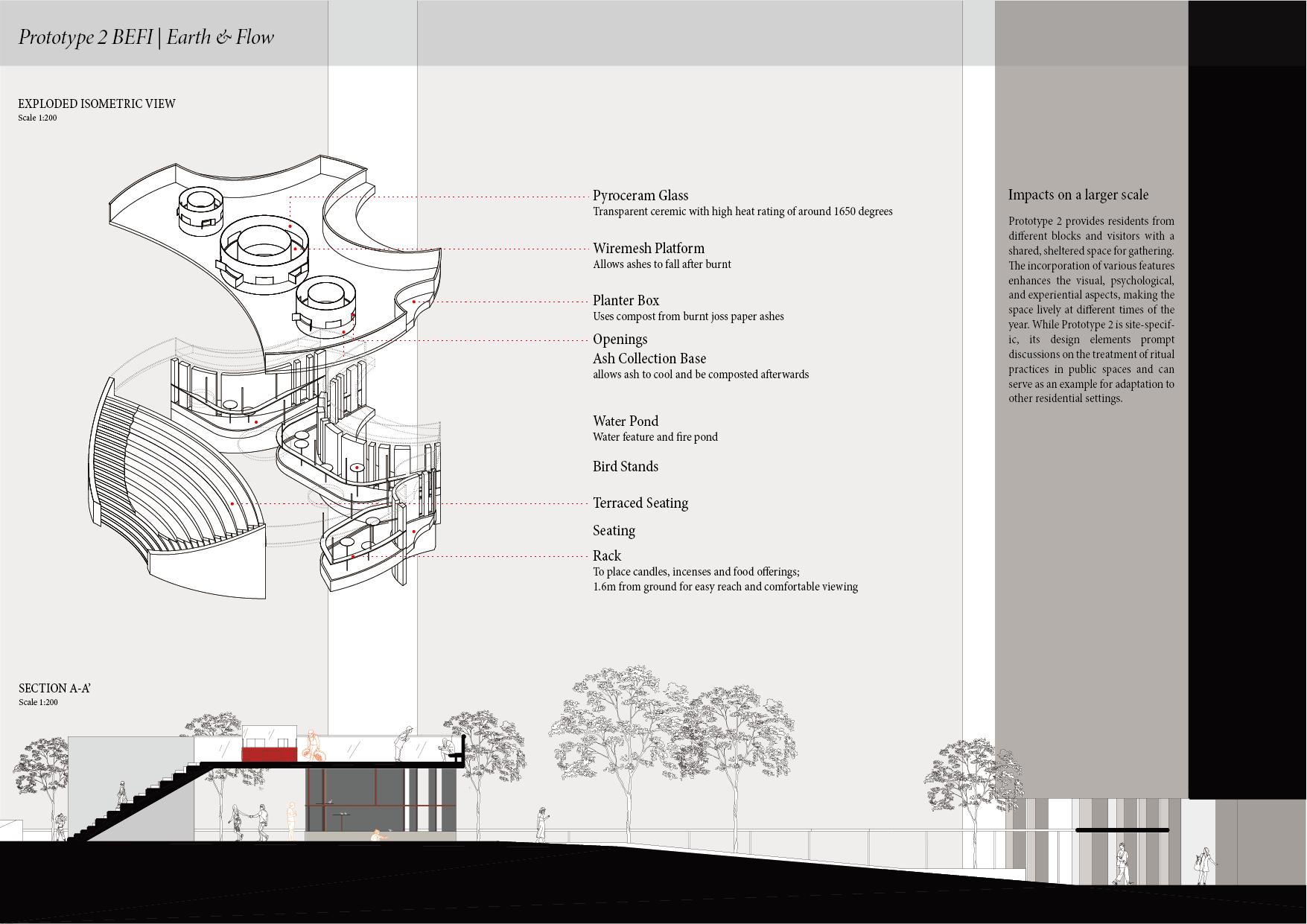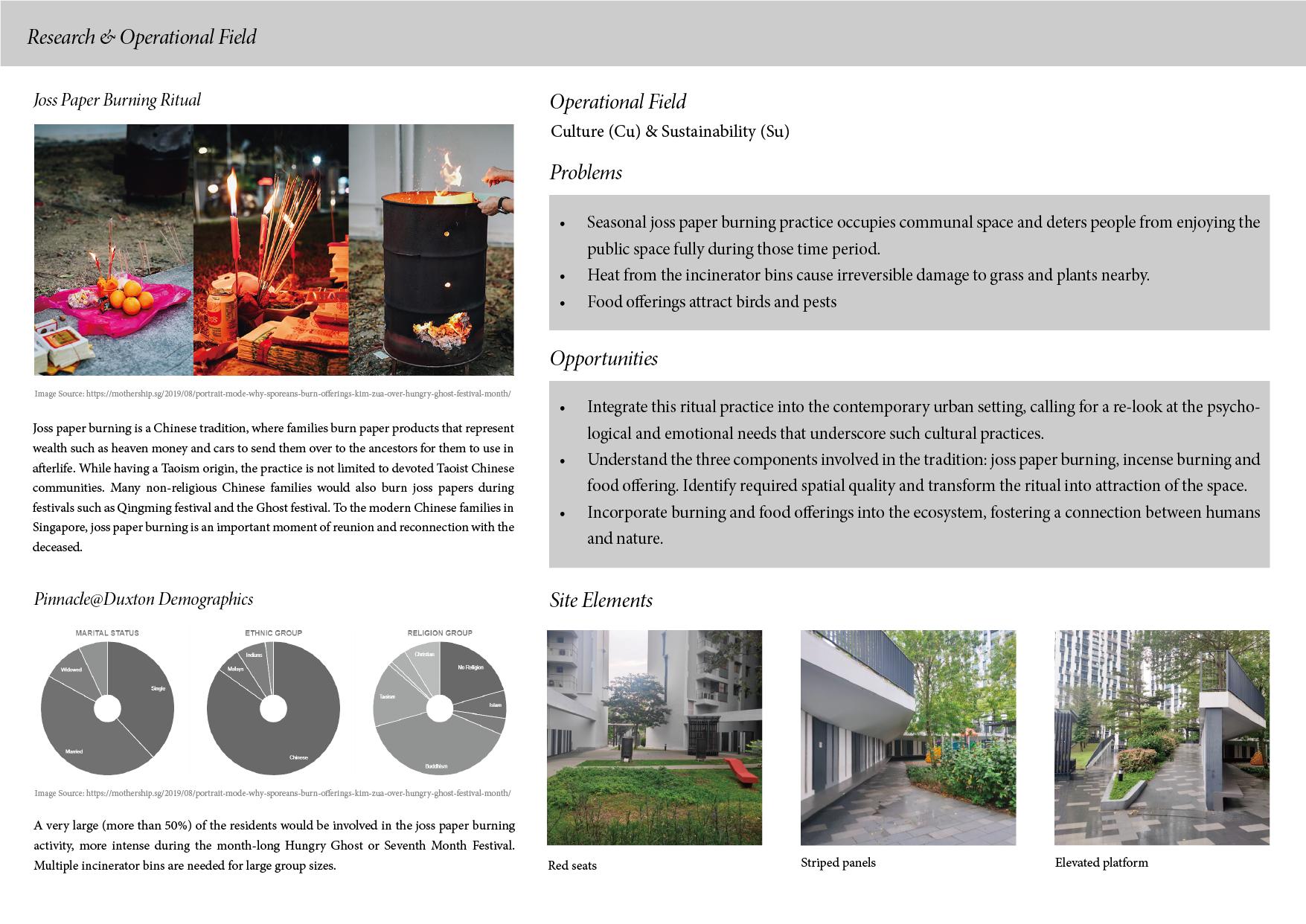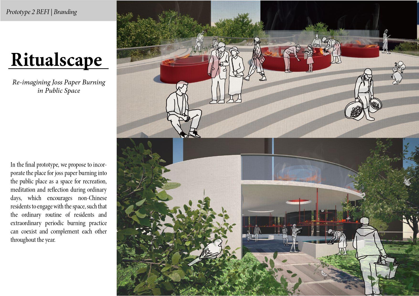The proposal ‘Ritualscape’ addresses the joss paper burning issue in Singapore’s residential areas. Rooted in cultural understanding, it acknowledges its adverse impact on the natural environment and potential effects on social cohesion. Aligning with the seasonal nature of the ritual and adhering to the urban theory of the ‘Right to the City,’ the final prototype designs a multi-use space accommodating ritual practices and other public bonding programs throughout the year. Notably, the design details prioritize sustainability and foster interactions between humanity and nature.