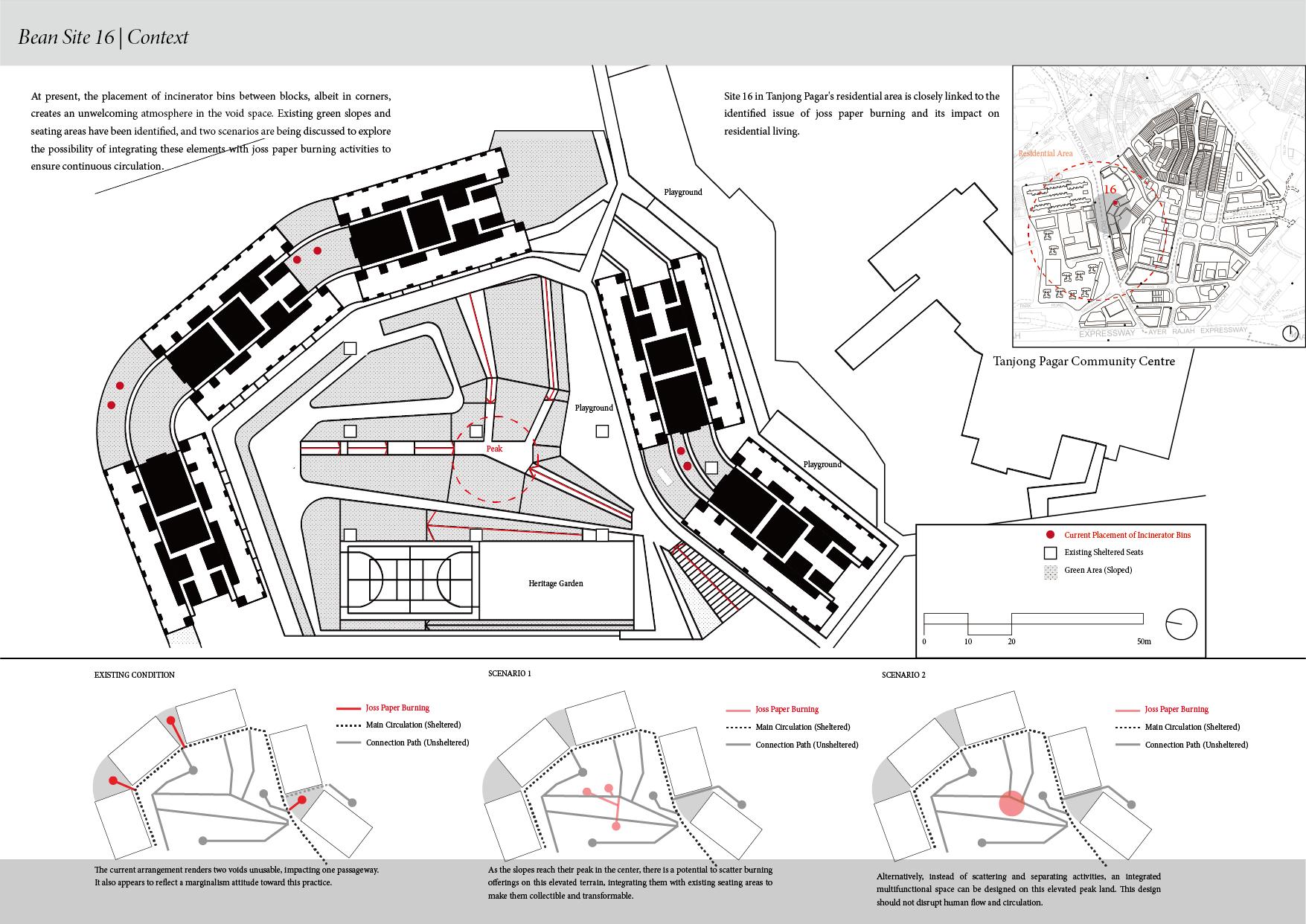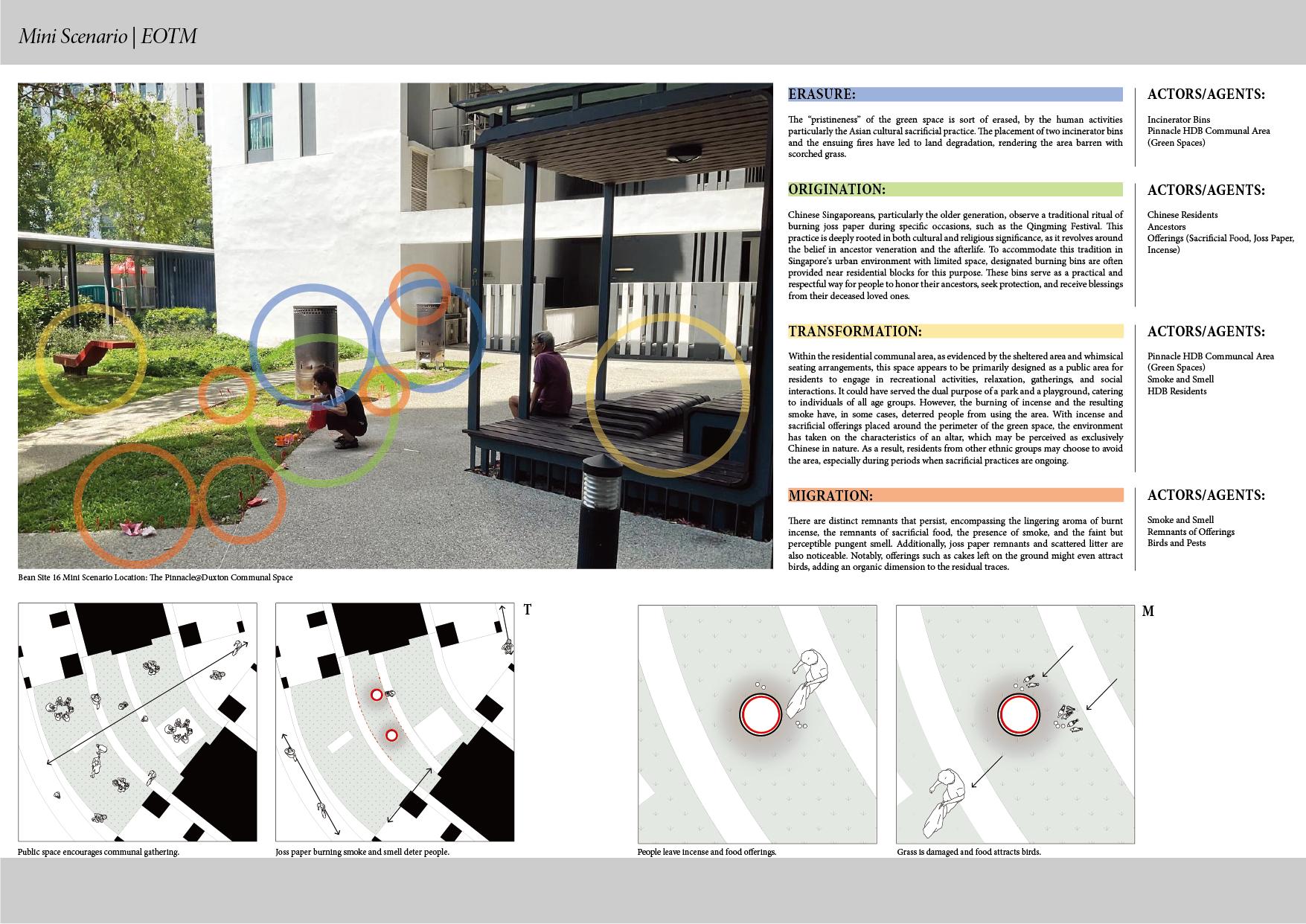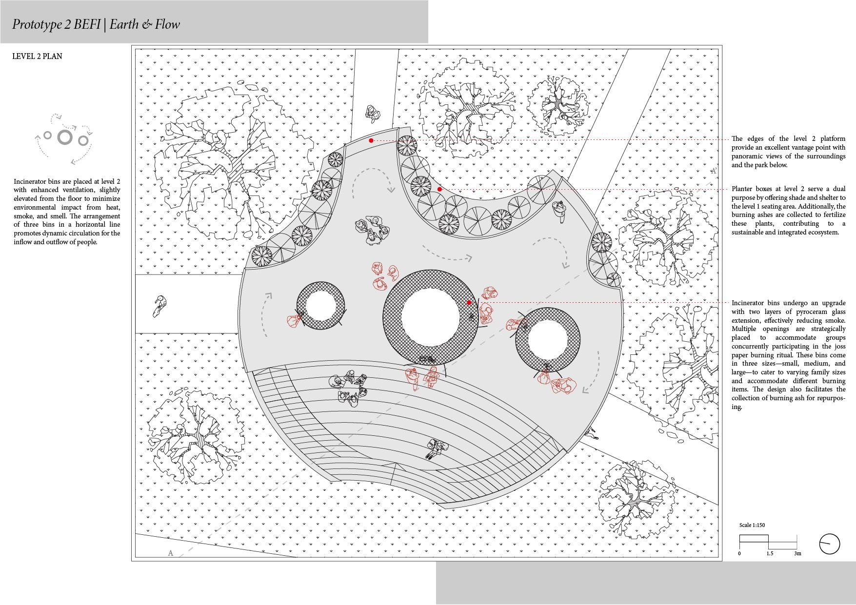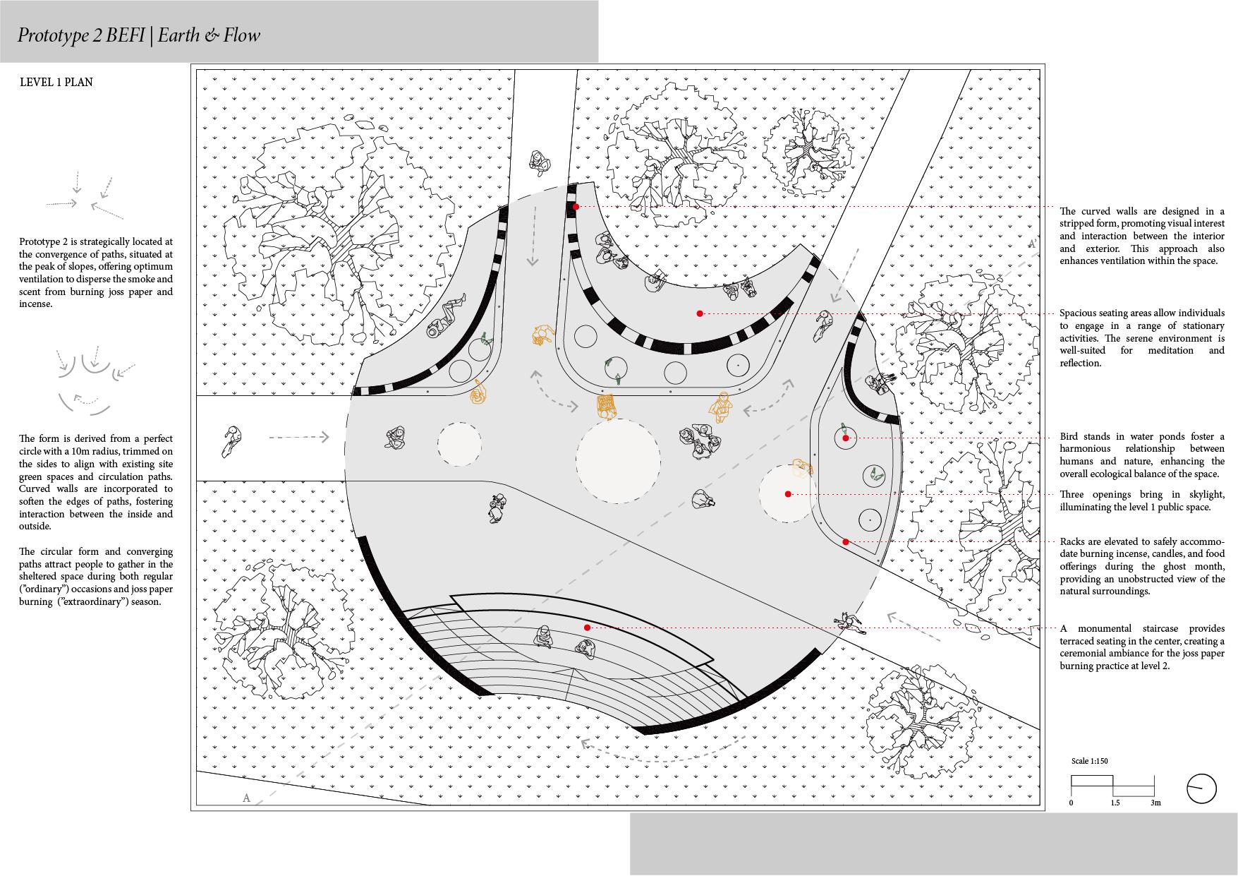 The proposal ‘Ritualscape’ addresses the joss paper burning issue in Singapore’s residential areas. Rooted in cultural understanding, it acknowledges its adverse impact on the natural environment and potential effects on social cohesion. Aligning with the seasonal nature of the ritual and adhering to the urban theory of the ‘Right to the City,’ the final prototype designs a multi-use space accommodating ritual practices and other public bonding programs throughout the year. Notably, the design details prioritize sustainability and foster interactions between humanity and nature.