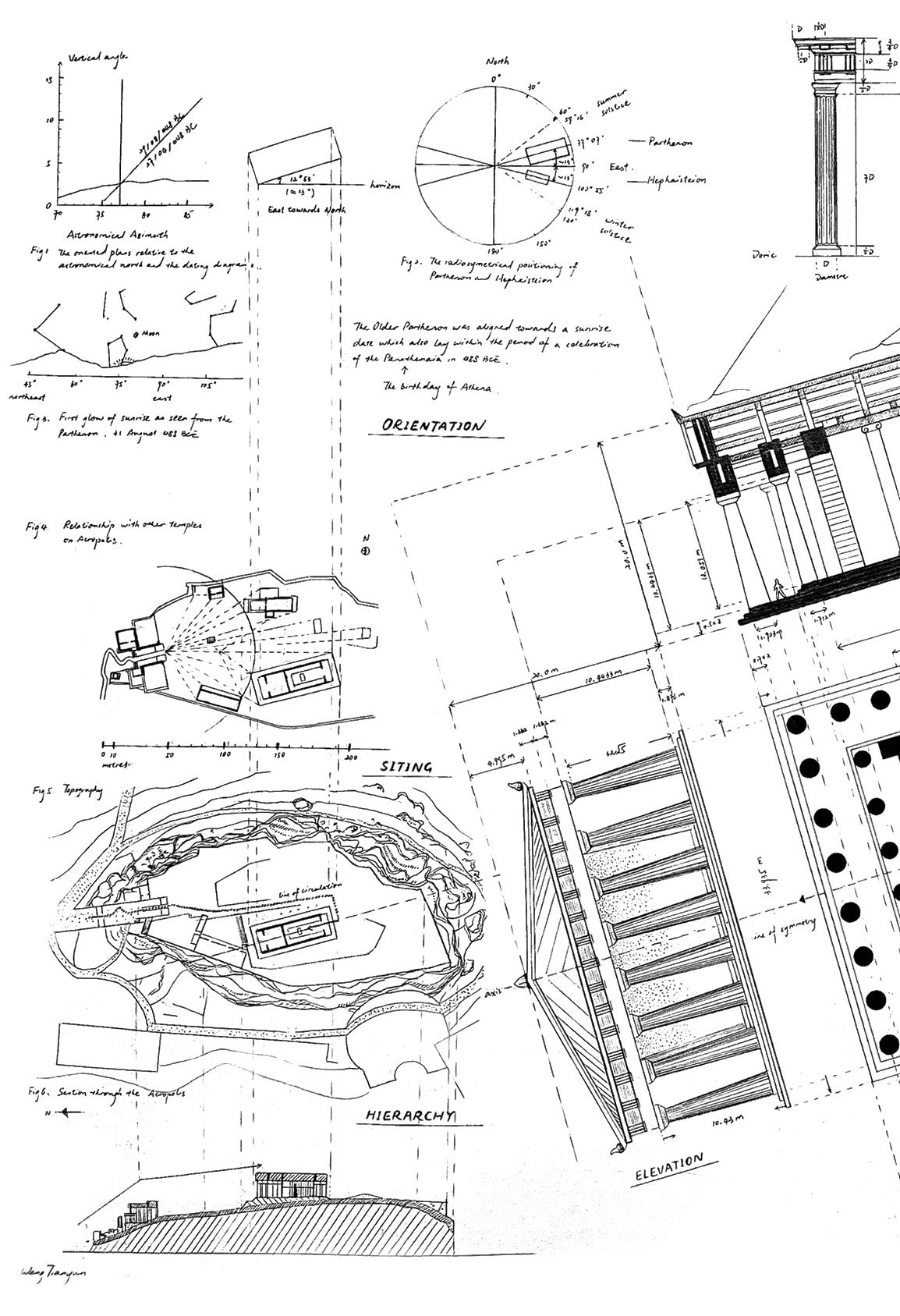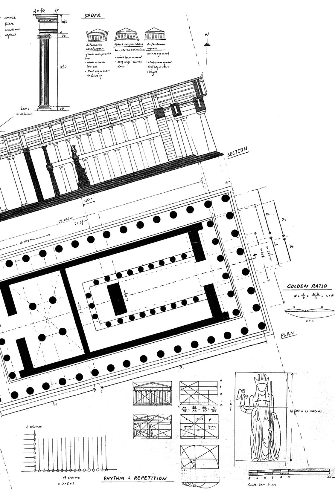 The theme for my drawings is Beauty in Science and Perfection. The plan is angled at 13 degrees following how the Parthenon building is orientated at an angle to the north point. The angle is special because it was painstakingly found by Greek scientists and mathematics so that on the birthday of goddess Athena, Parthenon would be directly facing the sunrise. The section and elevation are correspondingly extruded from the plan using generating lines with an intent to express the idea that the building was designed in a system proportions that binds all three into one.
