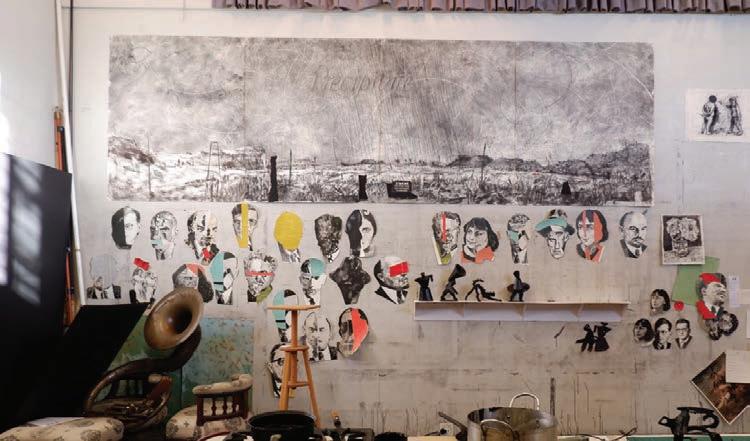Kentridge’s studio, 2022; the artist poses for his wife, Anne Stanwix, with studio manager Anne McIlleron, Norval Foundation curator Owen Martin, artist Karel Nel and literary scholar Stephen Clingman, 2019; ‘Drawing for Other Faces’, 2011; works in preparation for Kentridge’s exhibition at Goodman Gallery, London, 2022.