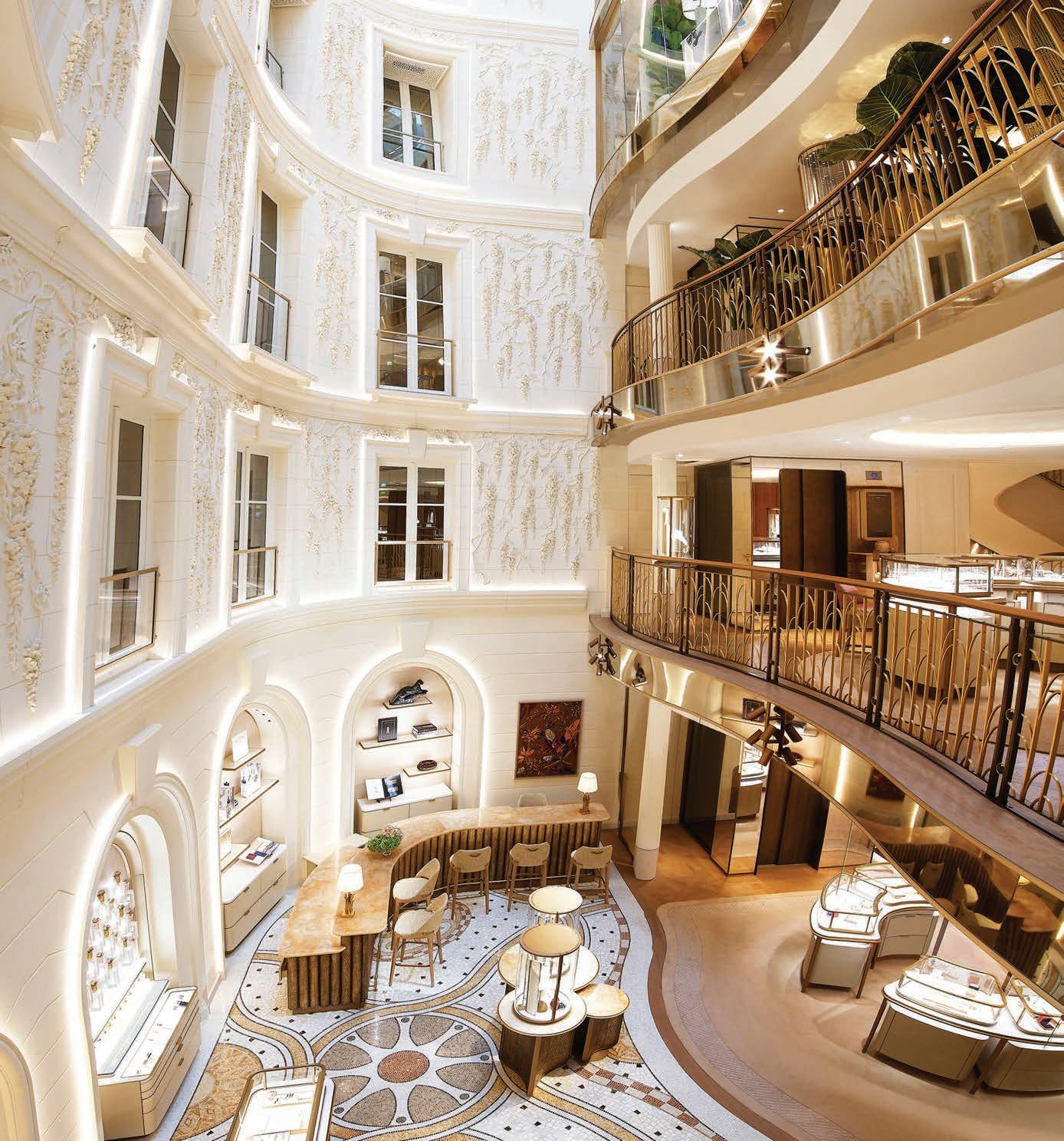 Indoors, the space is filled with theatrical encounters. Each floor features extraordinary décor reminiscent of the Garland style and Tutti Frutti design, as well as the symbolism of the Trinity collection and emblematic panther.