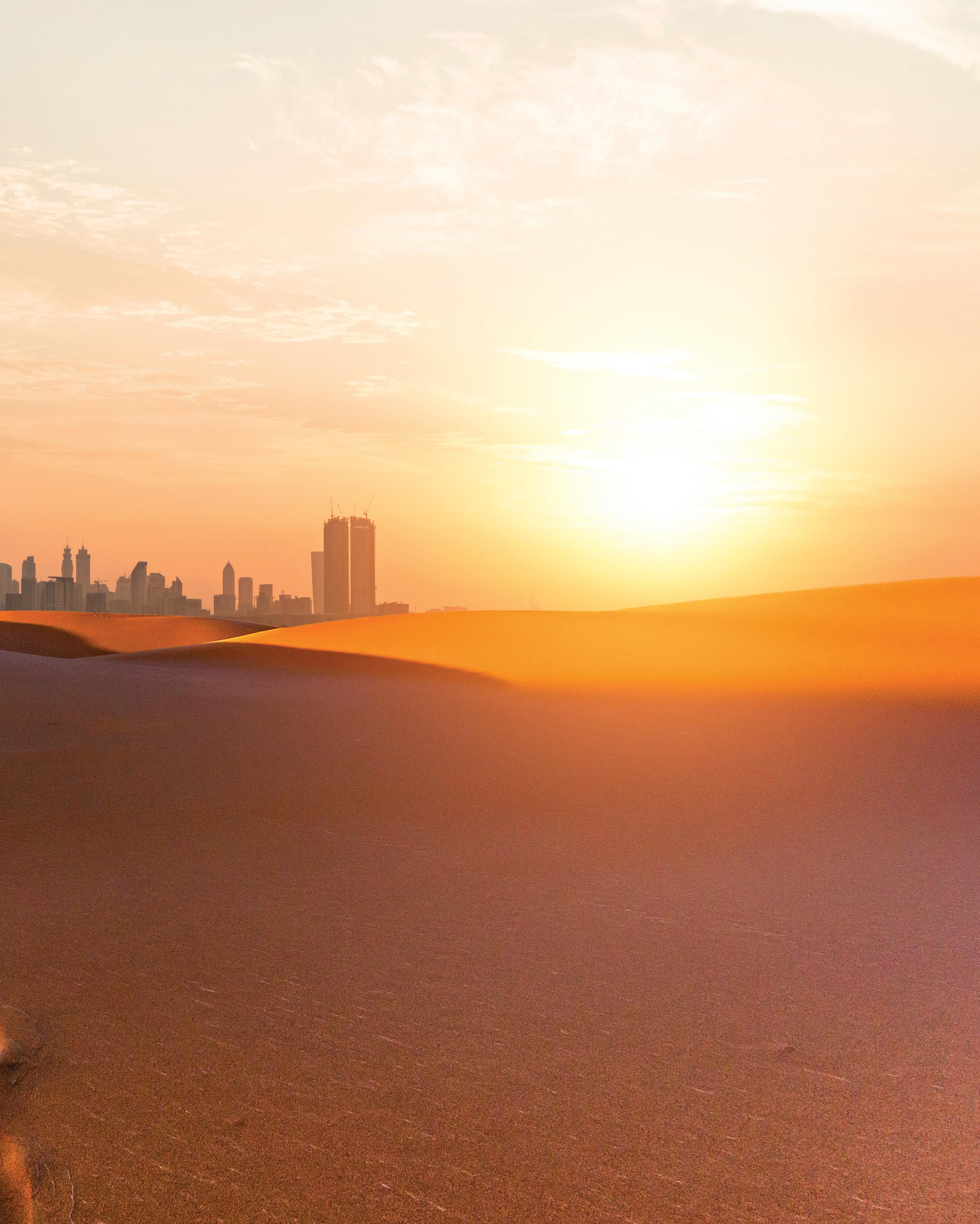 Dubai at sunrise. The austere beauty of the desert a foreground to the city’s skyline, with the elegant Burj Khalifa taking centre stage.