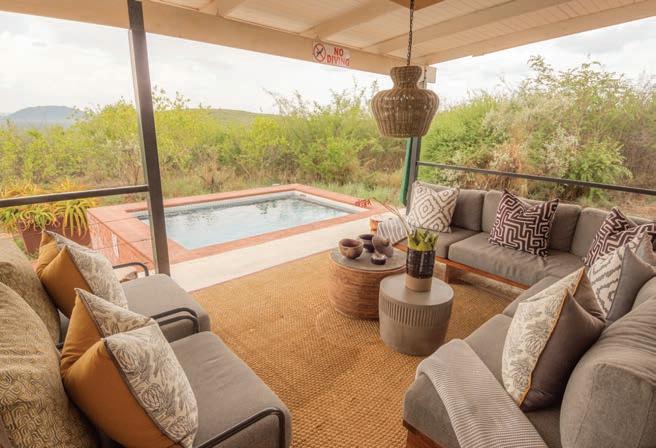 Tshukudu Villa had a wide stoep, boma for braaiing, outdoor shower and private plunge pool; the waterhole at Vleisfontein is a sundowner spot, popular with both humans and big game; the villas at RockFig Lodge are modern and well-appointed with fully equipped kitchens and comfortable living rooms; snoozes and yoga after a busy night of hunting.