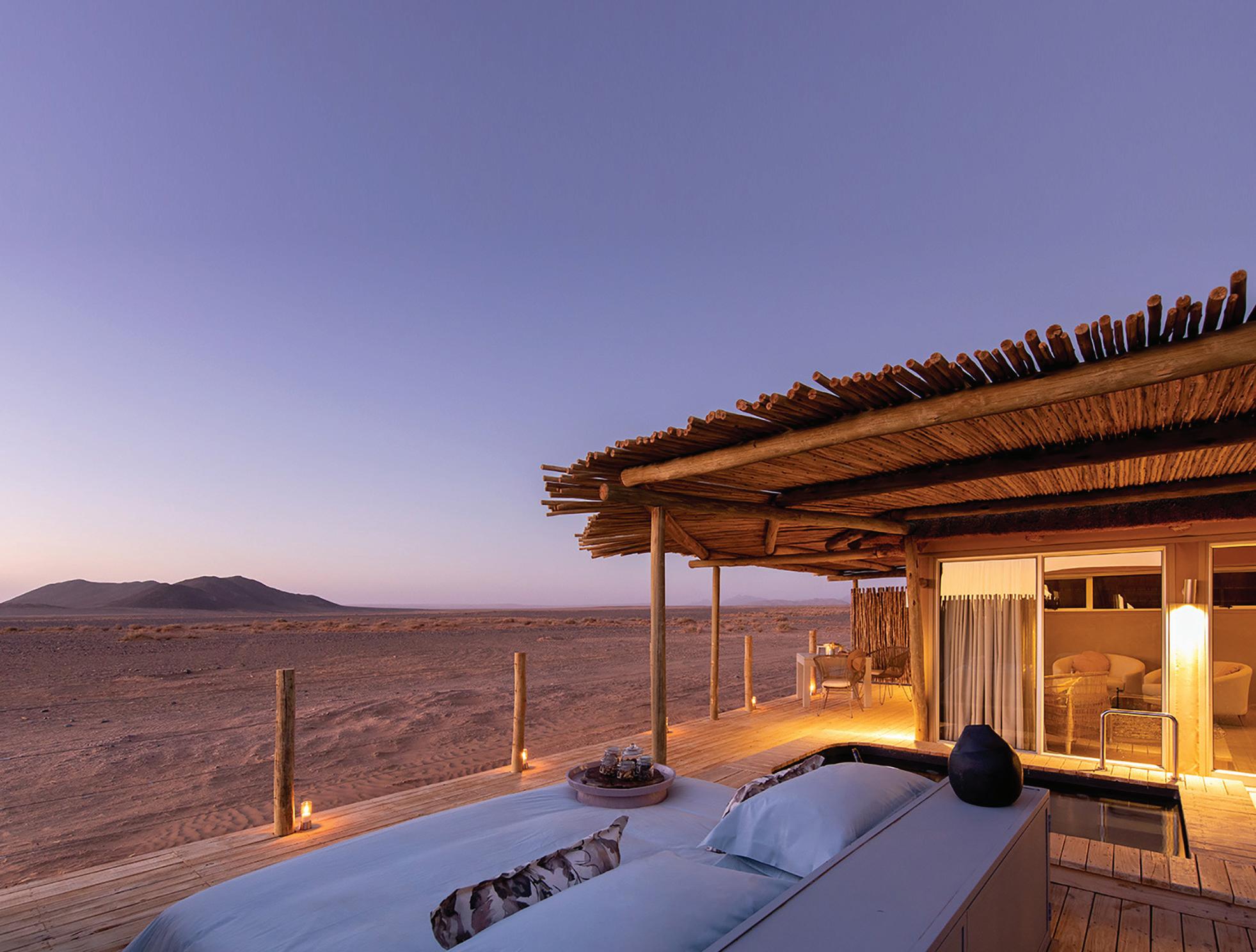 ABOVE AND RIGHT: Little Kulala, Wilderness’s property on the edge of Sossusvlei, features day beds under the stars and spa pools on porch suites. Balloon safaris over the Sossusvlei dunes leave early in the morning, offering a bird’s-eye view of the desert sunrise.