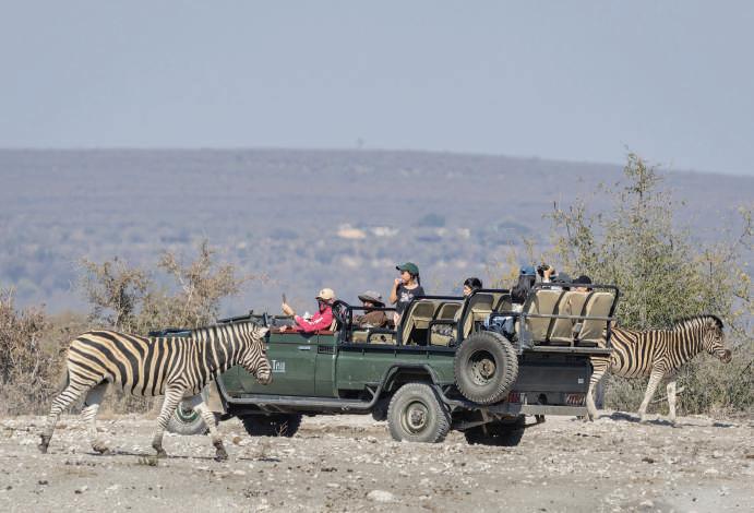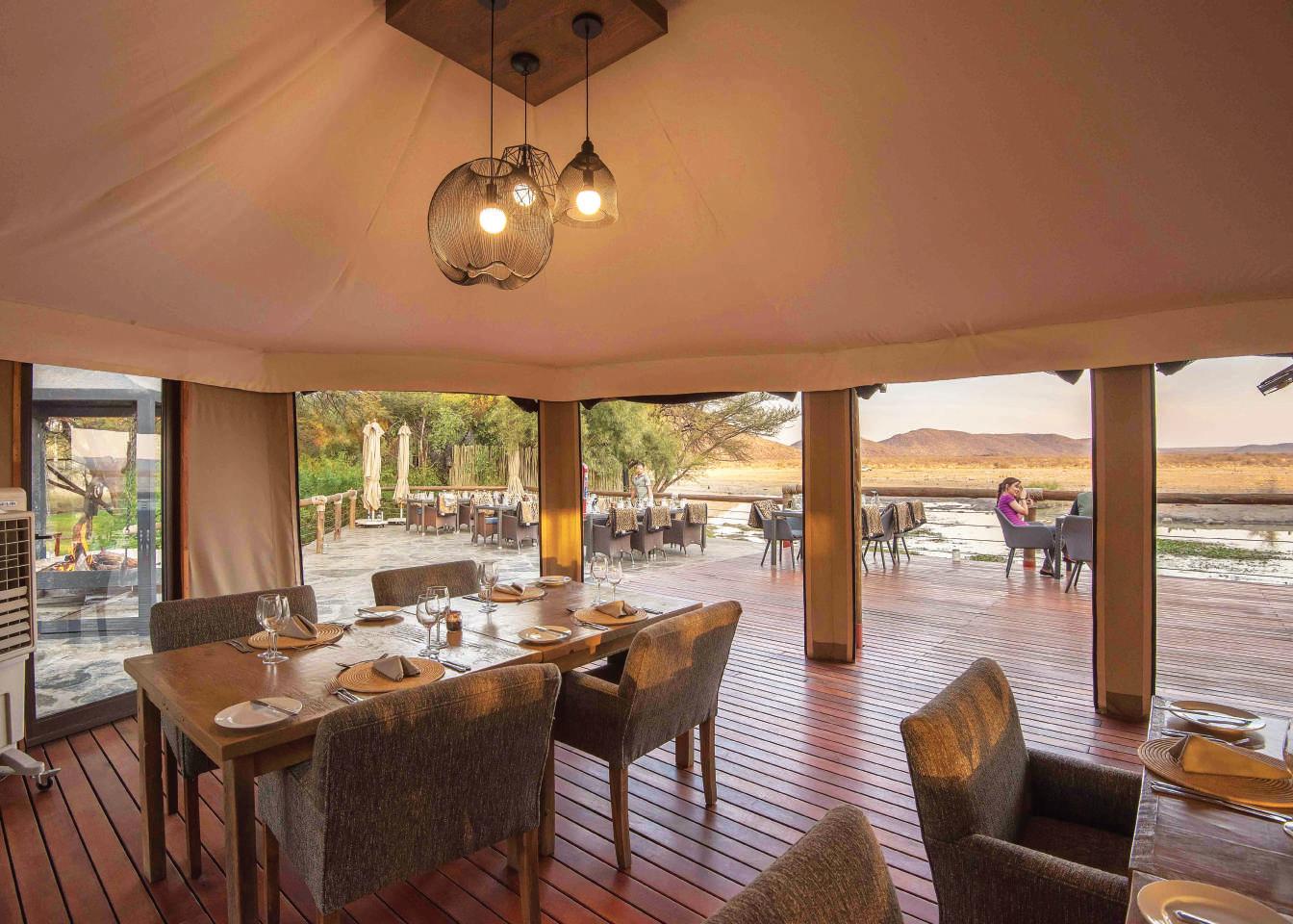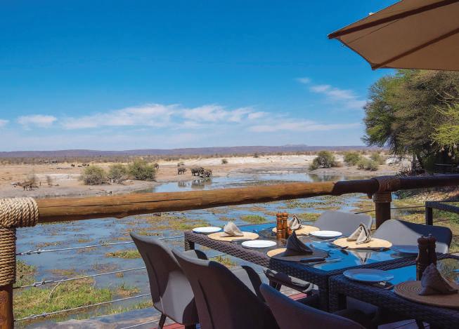 OPPOSITE, CLOCKWISE FROM TOP LEFT Enjoy five-star dining complemented by Big-Five game viewing at Tau Game Lodge’s largest waterhole; twice-daily game drives guided by expert rangers offer up-close game-viewing opportunities; sumptuous meals are served in either the main lodge or in the outdoor private boma under the stars; each chalet boasts luxurious interiors and features a private wooden deck overlooking a busy waterhole.
