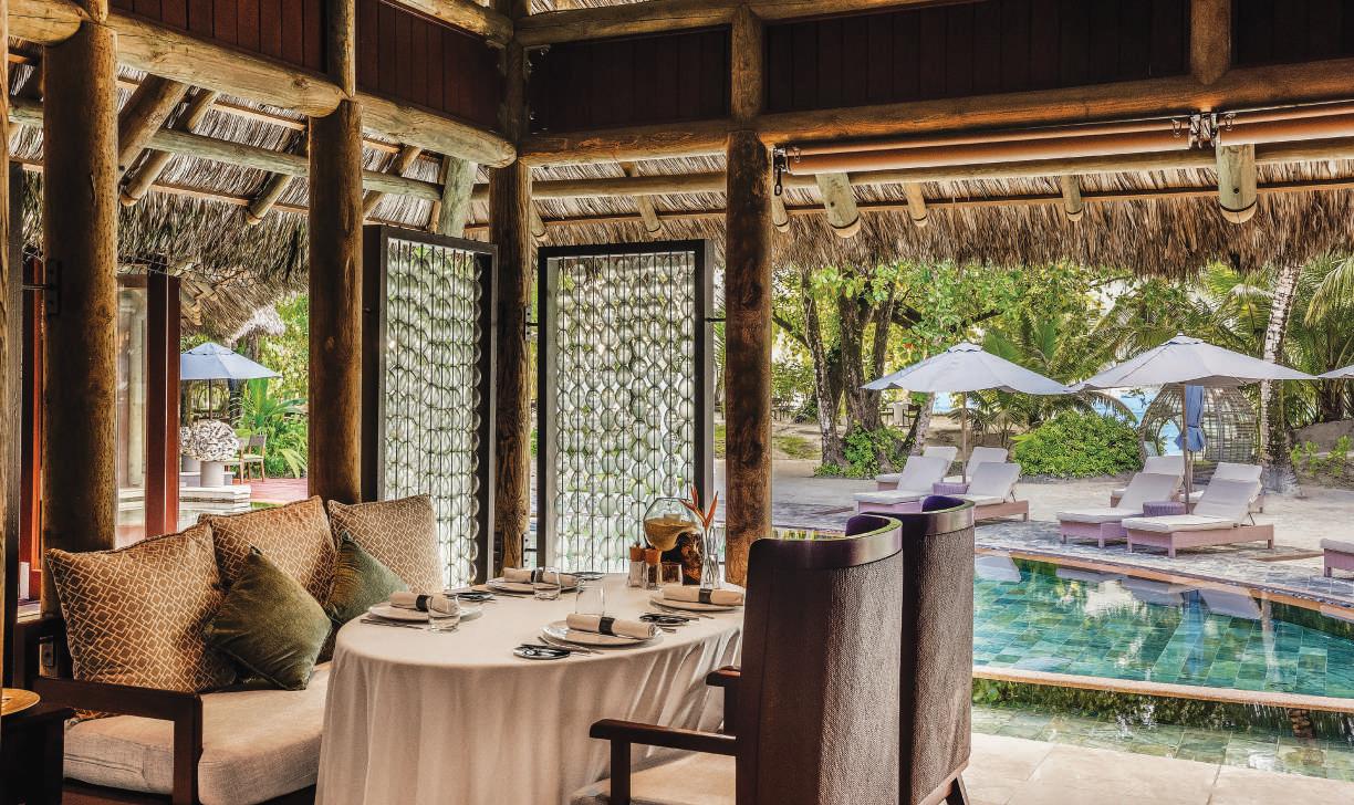 CLOCKWISE FROM FAR LEFT Cyann, Constance Ephelia’s signature restaurant, overlooks the marine park, and offers a hybrid of French technique and Asian flavours on its menu; the bay becomes a playground, but also a feast for the senses; the exclusive, high-end Hillside Villas at Constance Ephelia are built directly into the granite hillside, offering stunning, panoramic views of Port Launay Marine Park and North Beach.